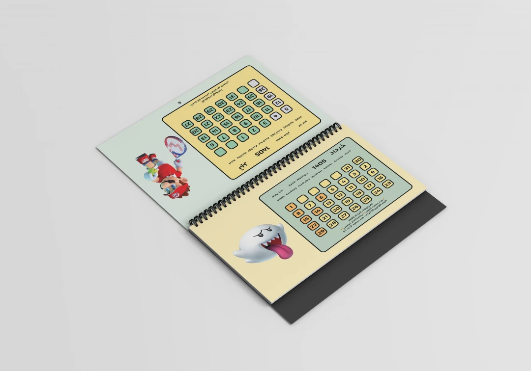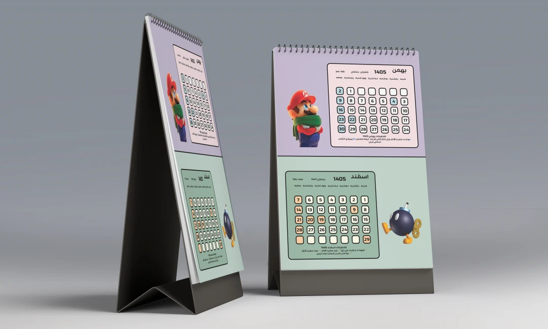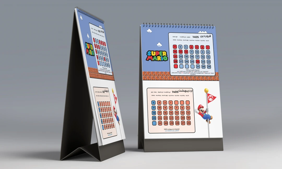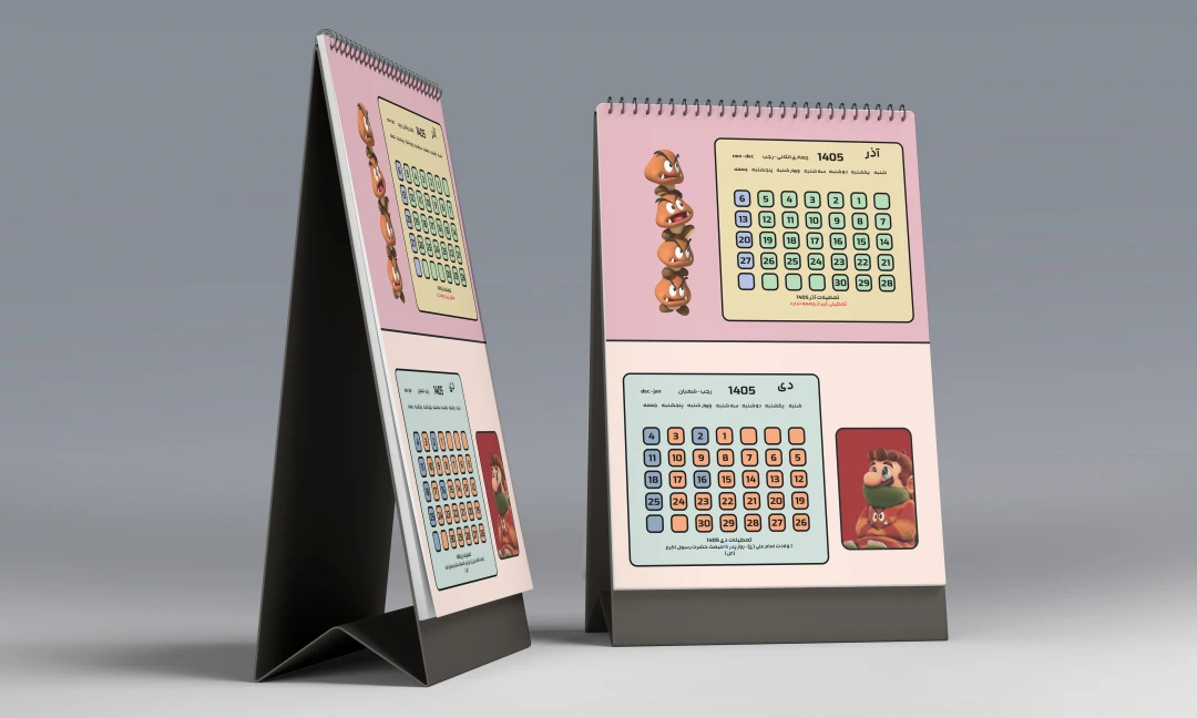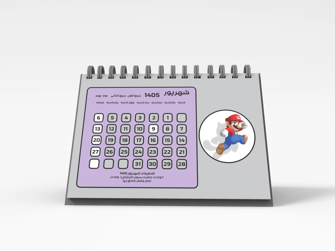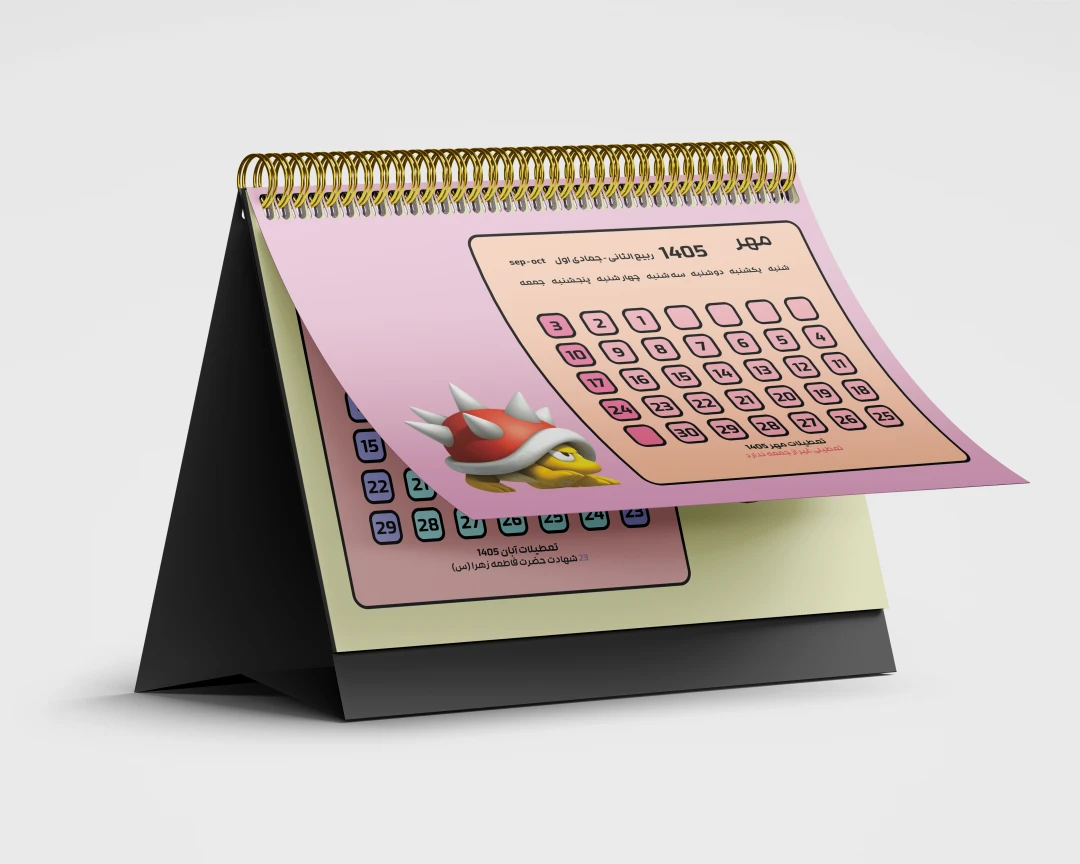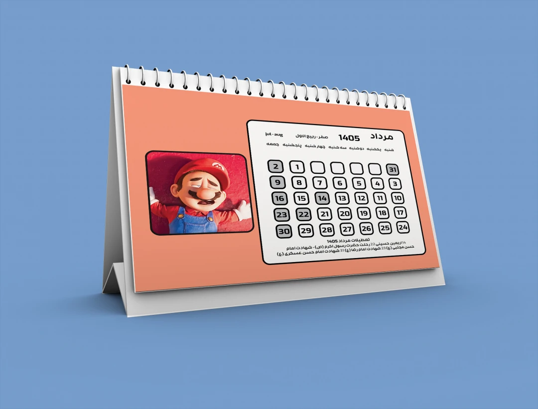 6 فایل طراحی psd با ابعاد A4 که هر فایل شامل دو ماه از سال بوده و باید از وسط برش داده شود . یعنی ابعاد هر ماه میشود ۲۱ در ۱۴.۸۵ سانتی متر