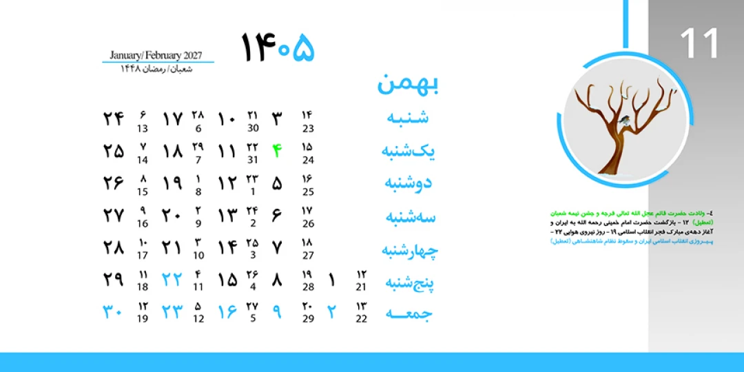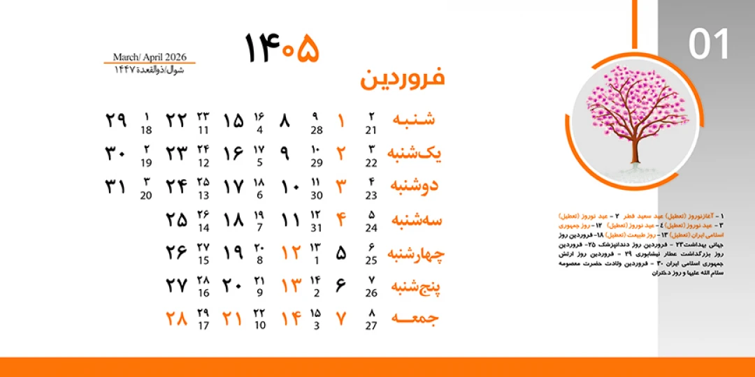تقویم، سالنامه، سررسید رومیزی 1405 طرح لایه باز فتوشاپ همراه با مناسبت ها و تعطیلات، با رنگ بندی متناسب با هر فصل آماده چاپ در اندازه 22*11 با کیفیت بالا
