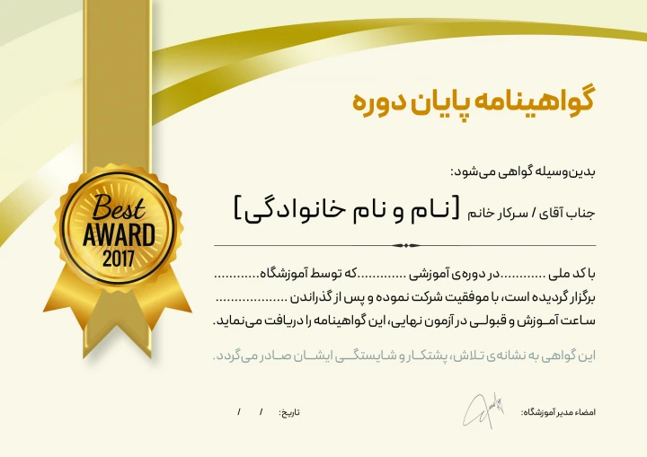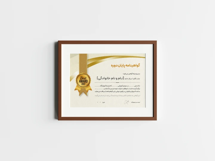 با این فایل PSD لایهباز و حرفهای، میتونید در چند دقیقه یک گواهینامه شکیل، شخصیسازیشده و آماده چاپ داشته باشید.