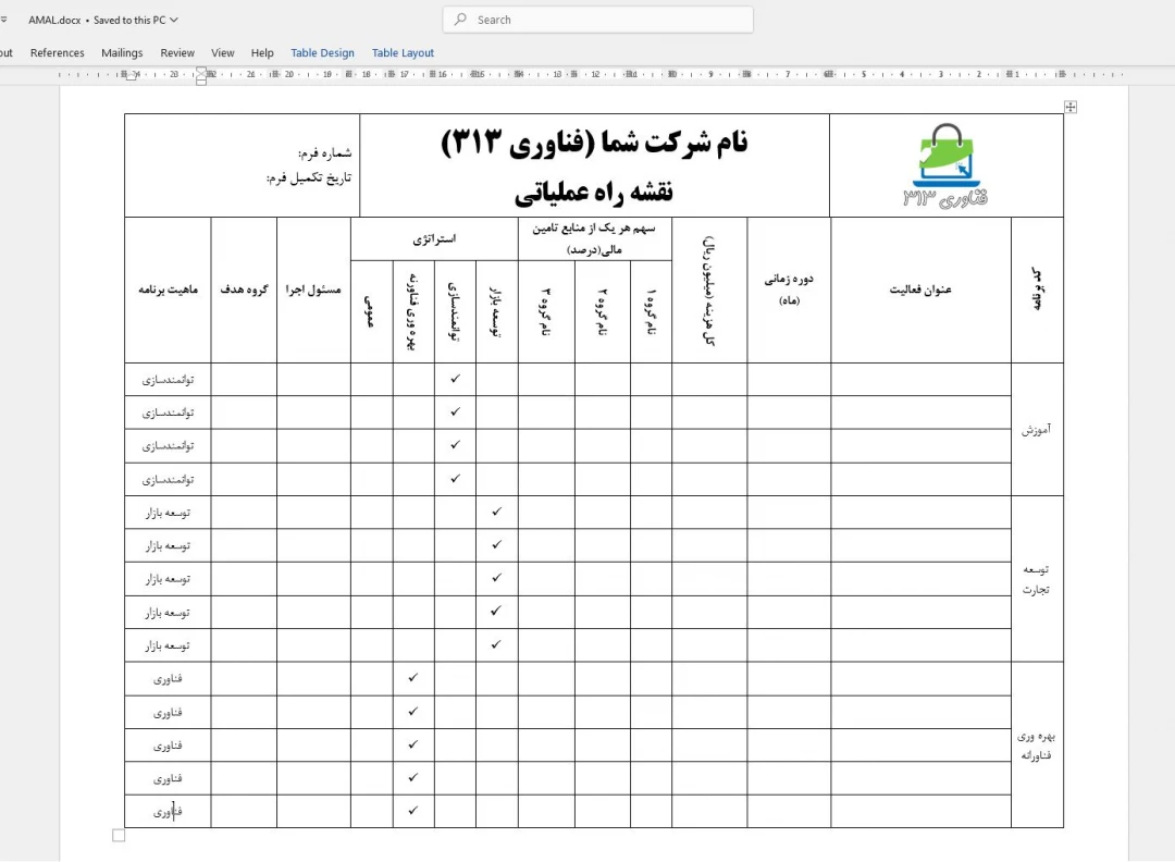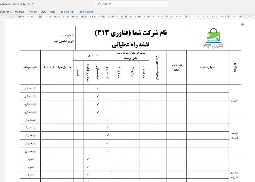 این فایل یک فرم جامع و استاندارد نقشه راه عملیاتی است که در فرمت Word طراحی شده و بهراحتی قابل ویرایش میباشد. با استفاده از این فرم میتوانید بهصورت رسمی و ساختاریافته برنامههای سالانه، پروژهها و فعالیتهای سازمانی یا صنعتی را مدیریت کنید