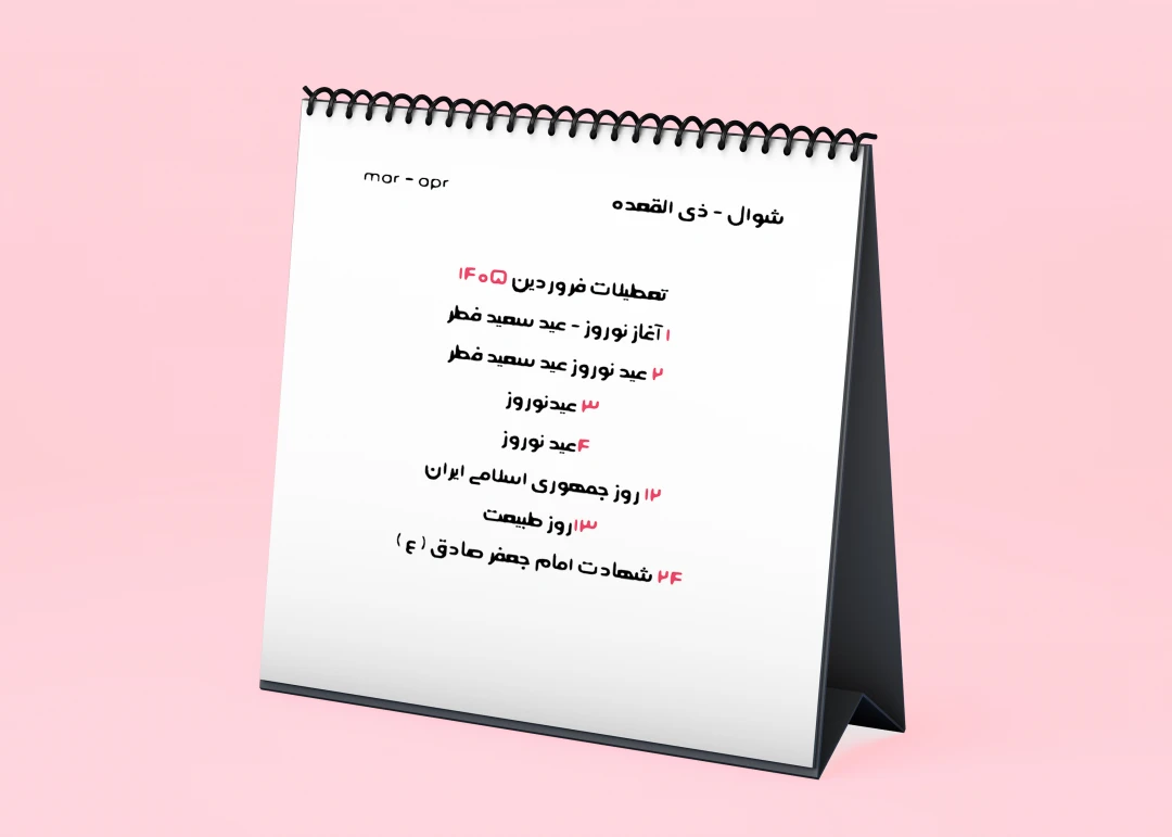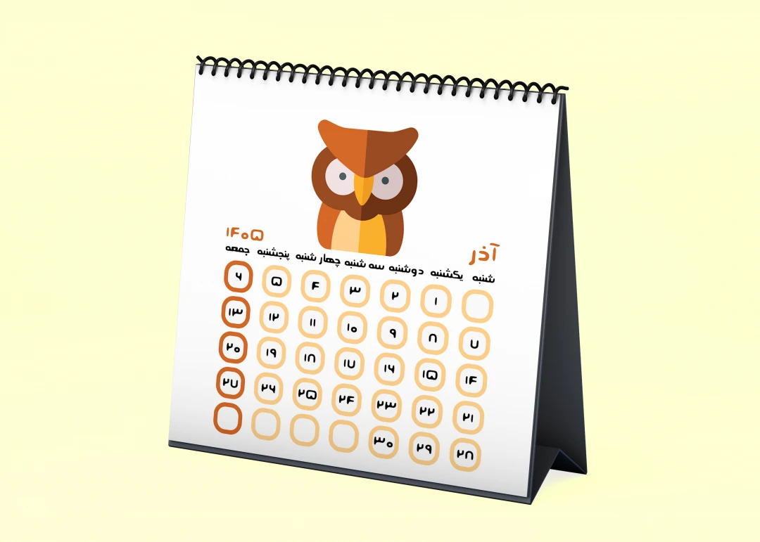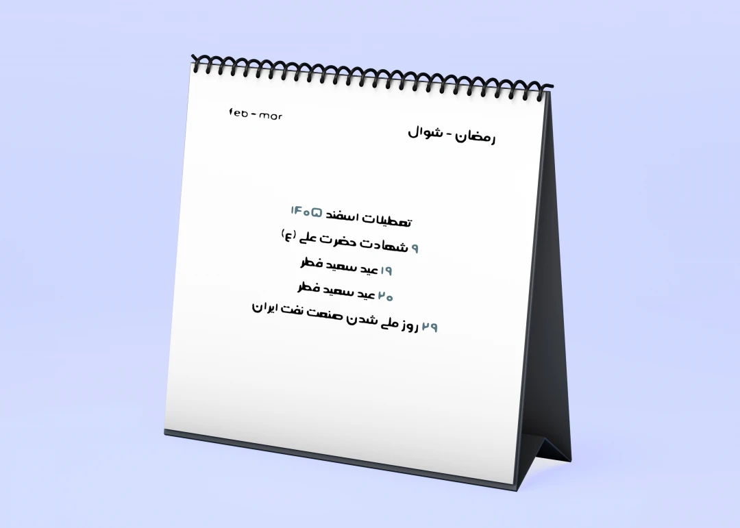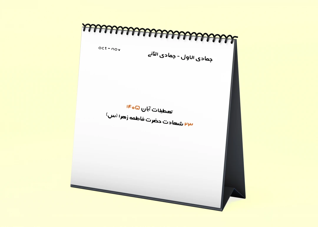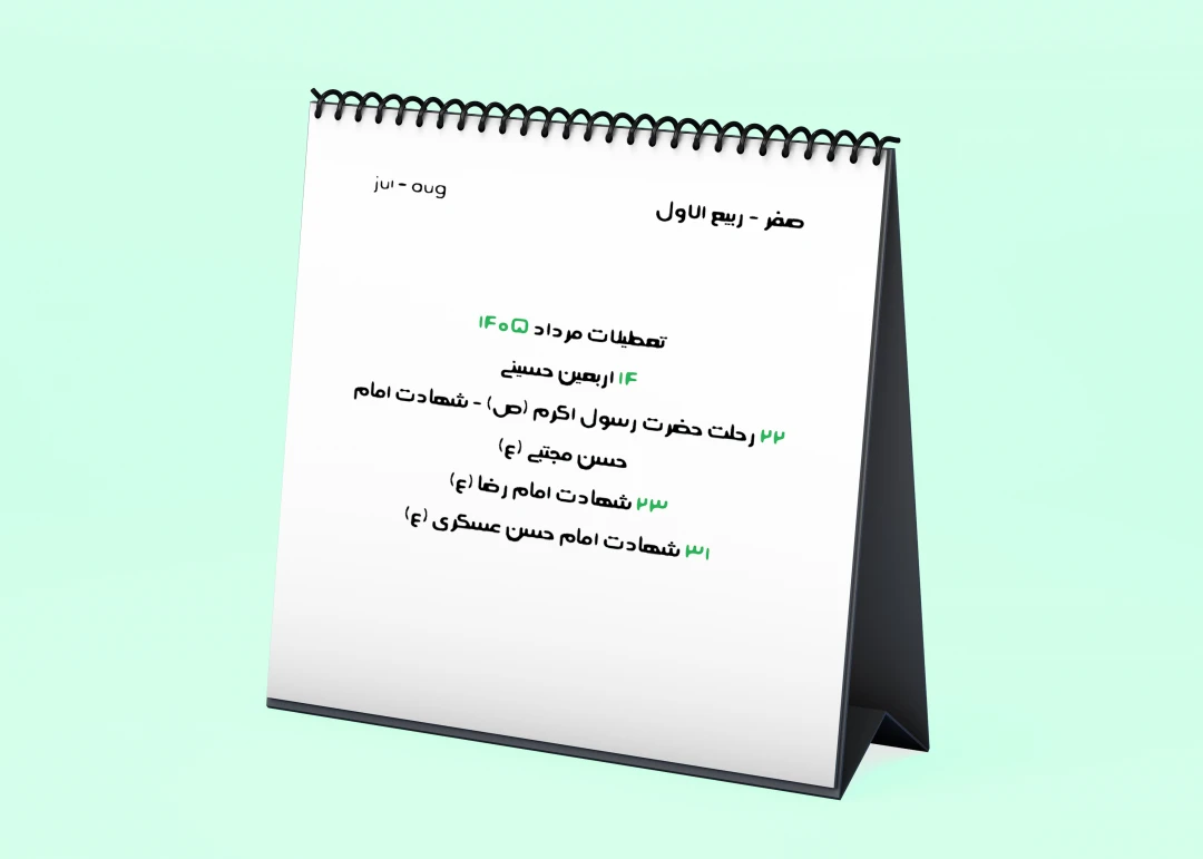 امکان تغییر تاریخ تعطیلات و مناسبات توسط شورای مرکز تقويم مؤسسۀ ژئوفيزيك دانشگاه تهران وجود داشته و مسئولیتی به عهده طراح نمی باشد . لذا خریدار باید قبل از چاپ تمام موارد طراحی و رنگ را جهت اطمینان نهایی چک کند .