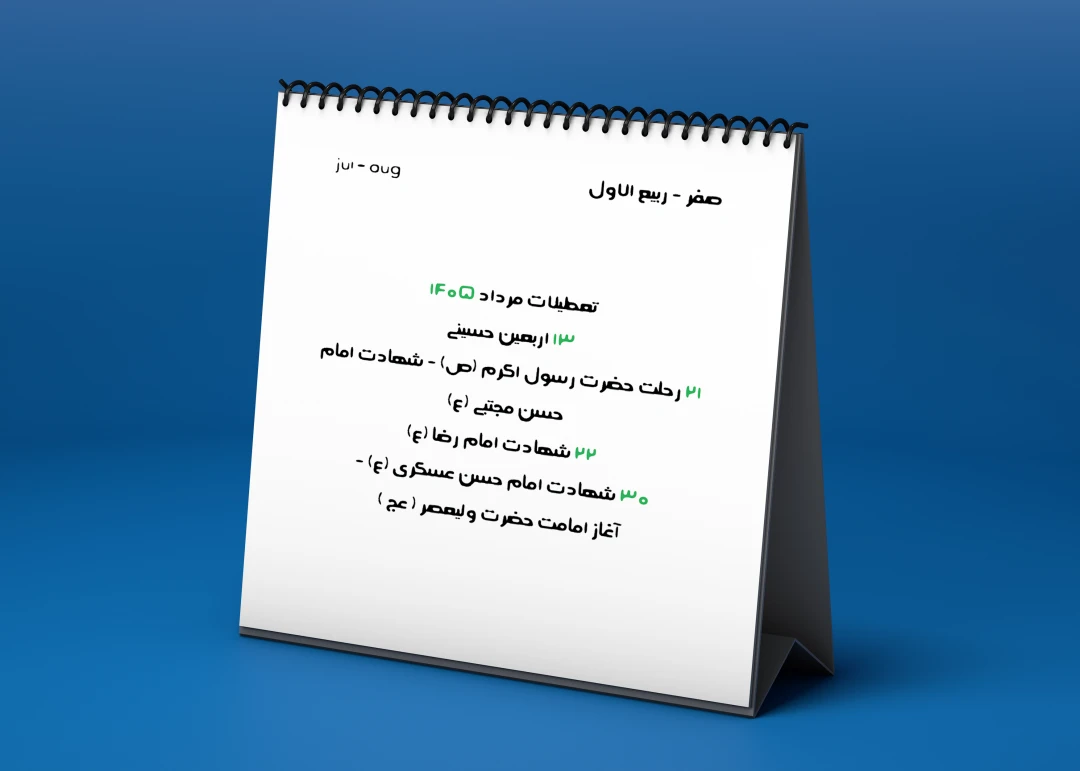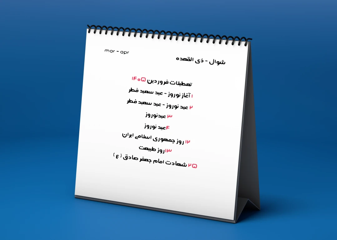 تقویم سال ۱۴۰۵ الگو گرفته از تقویم رسمی منتشر شده توسط شورای مرکز تقويم مؤسسۀ ژئوفيزيك دانشگاه تهران بوده و در صورت وجود اشکال مسئولیتی بر عهده طراح نمیباشد . فایل pdf تقویم در فایل قرار داده شده و خریدار میتواند طرح را با آن چک و مطابقت داده و اقدام به چاپ کند . امکان تغییر تاریخ تعطیلات و مناسبات توسط شورای مرکز تقويم مؤسسۀ ژئوفيزيك دانشگاه تهران وجود داشته و مسئولیتی به عهده طراح نمی باشد