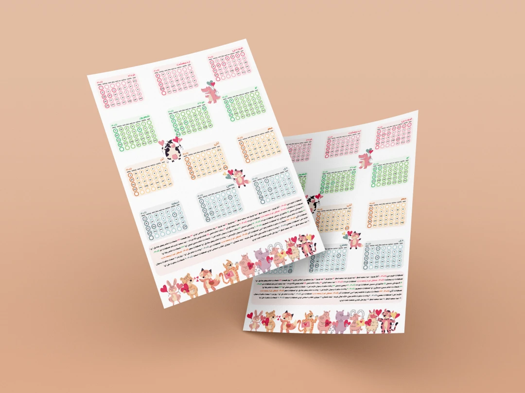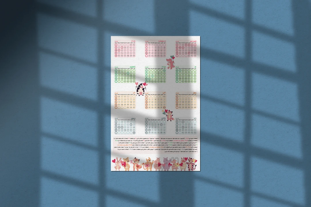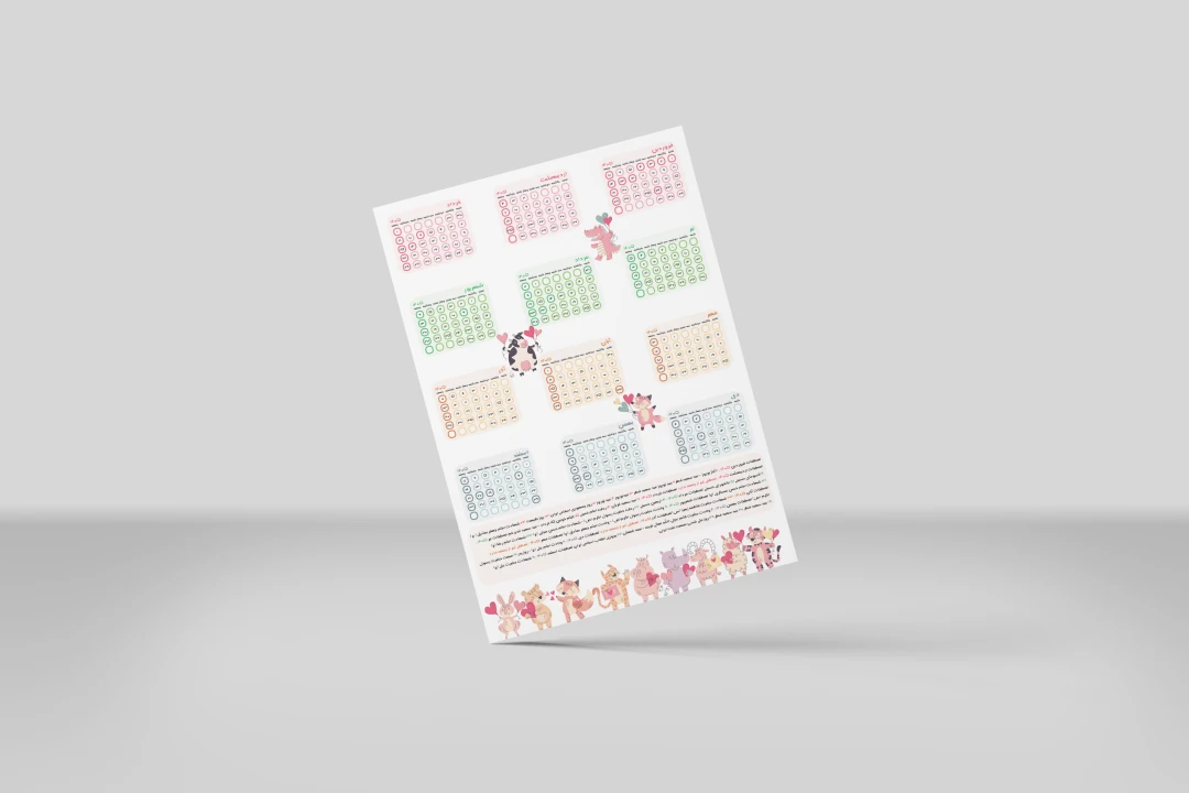 امکان تغییر تاریخ تعطیلات و مناسبات توسط شورای مرکز تقويم مؤسسۀ ژئوفيزيك دانشگاه تهران وجود داشته و مسئولیتی به عهده طراح نمی باشد . لذا خریدار باید قبل از چاپ تمام موارد طراحی و رنگ را جهت اطمینان نهایی چک کند .