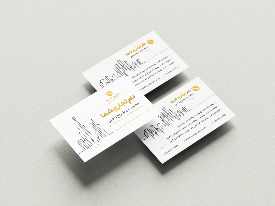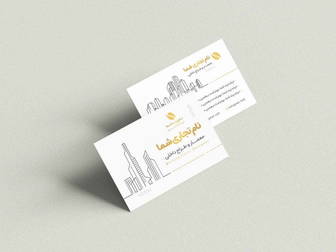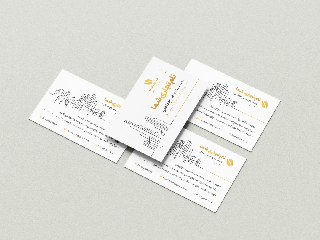 استفاده از رنگ طلایی و خطوط شهری در طراحی، حس لوکس و حرفهای به کارت میدهد و مناسب برندهای معماری و فضاهای مدرن است.