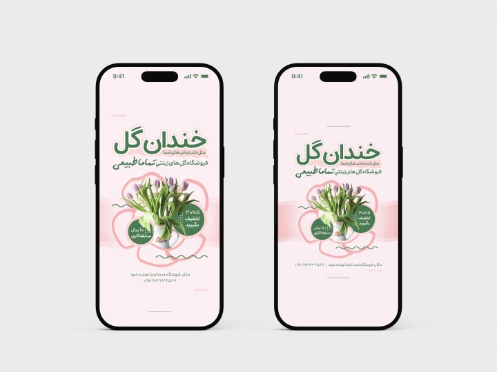 طرح لایه باز پوستر و قالب پست اینستاگرامی برای گل فروشی با طراحی لطیف و رنگهای طبیعی. قابل استفاده برای معرفی محصولات گل فروشی، تخفیف های فصلی و پستهای تبلیغاتی اینستاگرام.