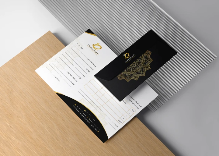در طرح لایه باز پاکت و فاکتور طلافروشی از آیتم هایی با استاندارد چاپ استفادهشده و همه موارد لازم مانند رنگبندی، رعایت حاشیه، فاصلهها، سایز و نوع فونت مناسب رعایت شده است.