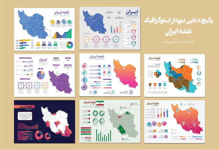 مجموعهای بینظیر از ۸ طرح لایه باز اینفوگرافیک نقشه ایران، طراحیشده برای نمایش دادههای آماری، جمعیتی، اقتصادی و جغرافیایی به صورت بصری و حرفهای.