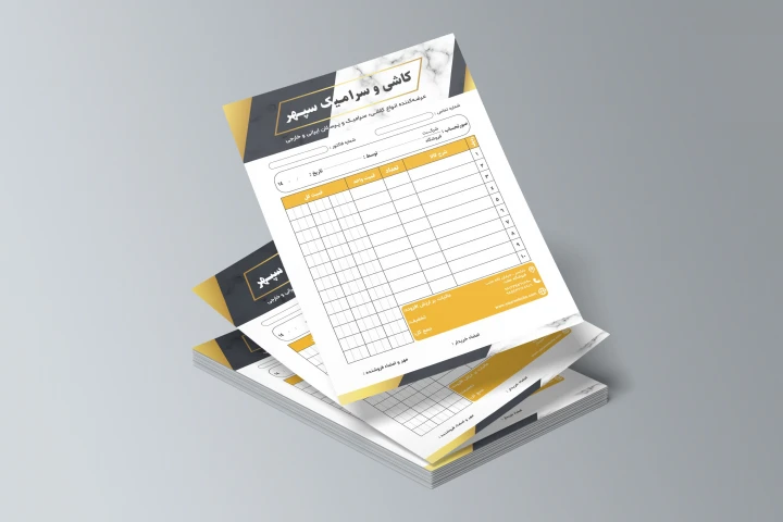 با استفاده از این طرح لایه باز فاکتور حرفهای کاشی و سرامیک فروشی، به کسبوکار خود جلوهای منظم و برندمحور بدهید. طراحی این فاکتور با ترکیب رنگهای مشکی، طلایی و بافت سنگ مرمر، ظاهری شیک و لوکس به اسناد فروش شما میبخشد.