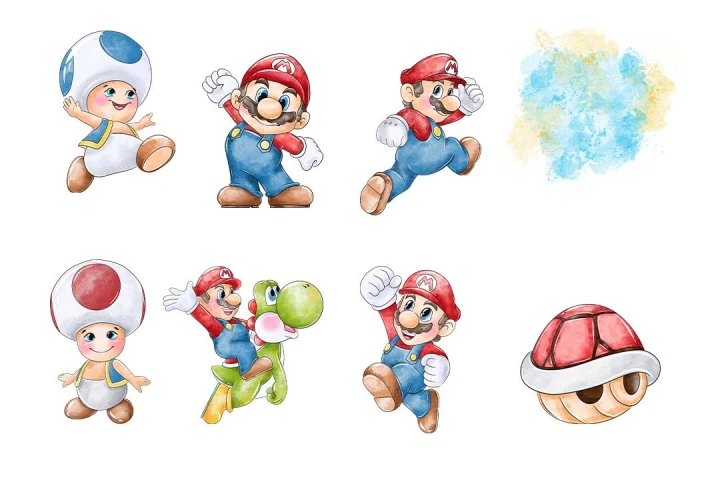 مجموعهای ویژه و حرفهای از کاراکتر Super Mario در 7 حالت مختلف به همراه 1 بکگراند آبرنگی (Watercolor) با کیفیت بسیار بالا و مناسب برای چاپ و انواع پروژههای گرافیکی.