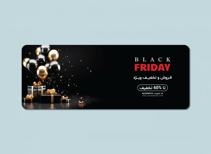 استفاده از رنگهای مشکی، طلایی و قرمز در این بنر باعث ایجاد جلوهای لوکس و چشمگیر شده که برای تبلیغ رویدادهای مهمی مانند فروش ویژه بلک فرایدی (جمعه سیاه)، حراج پایان فصل، تخفیف فروشگاههای آنلاین یا برندهای پوشاک و لوازم دیجیتال کاملاً مناسب است.