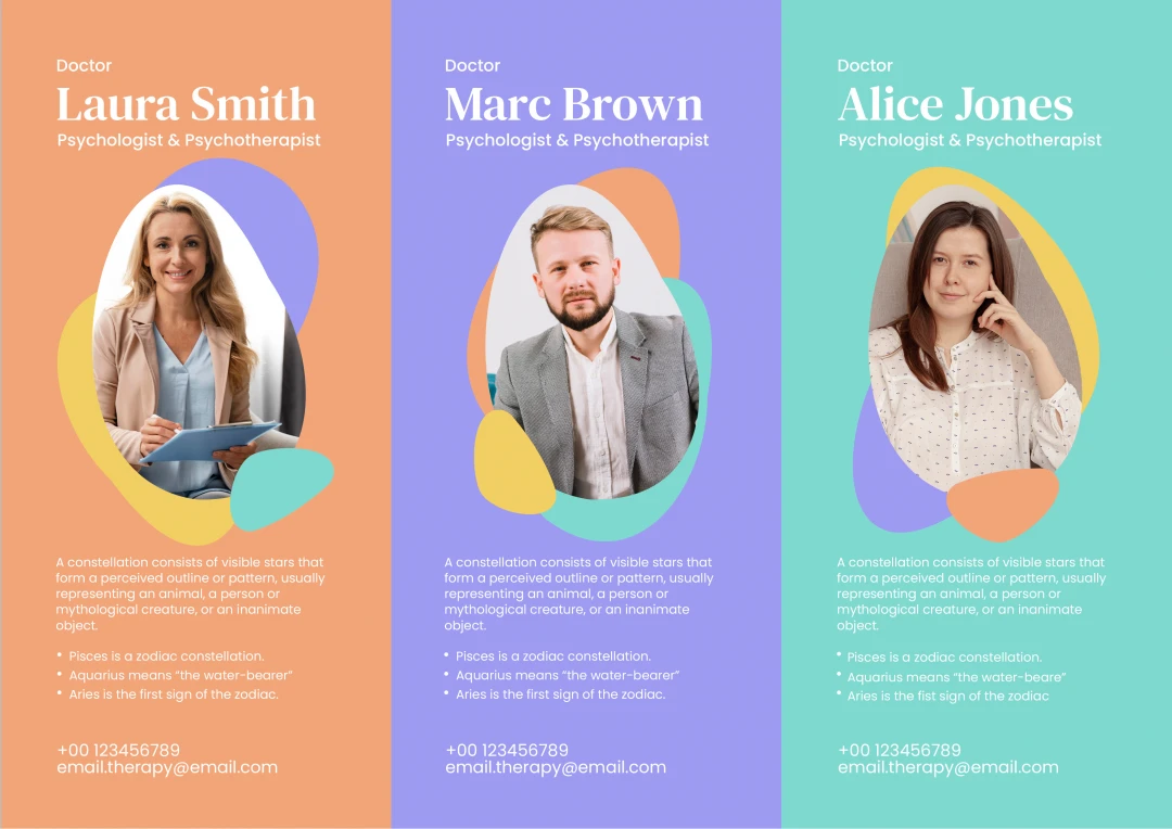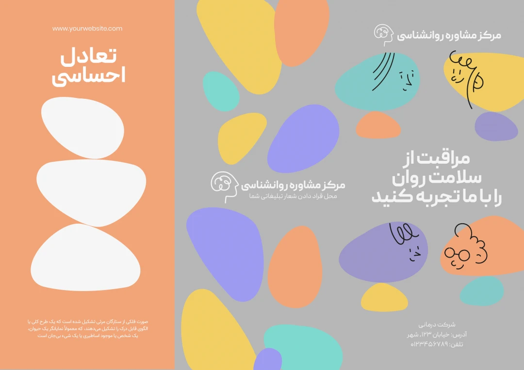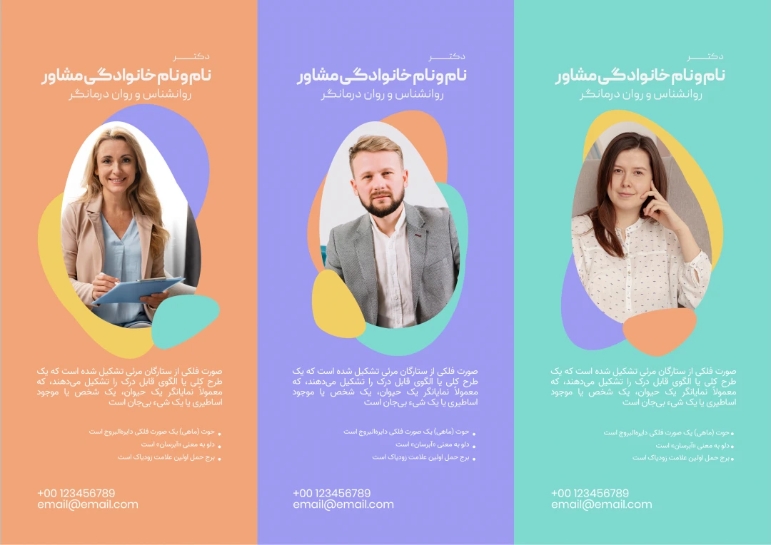 طراحی استاندارد، چینش هوشمندانه اطلاعات، رنگهای آرامشبخش و امکان شخصیسازی کامل باعث شده این بروشور بهترین انتخاب برای کلینیکهای سلامت روان، مراکز مشاوره و تراپیستها باشد.