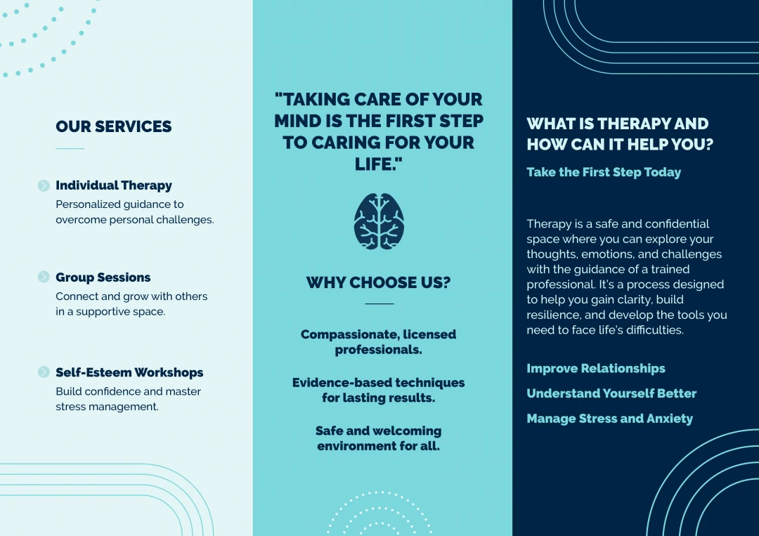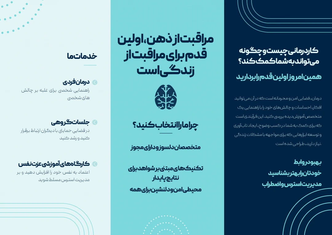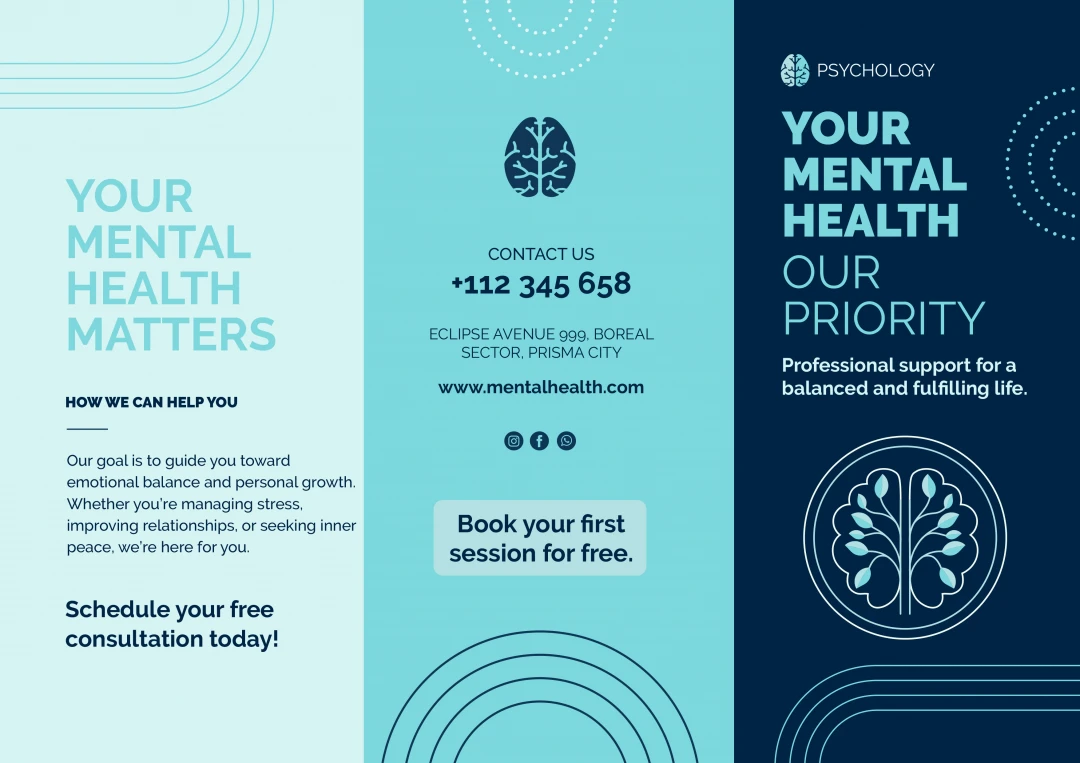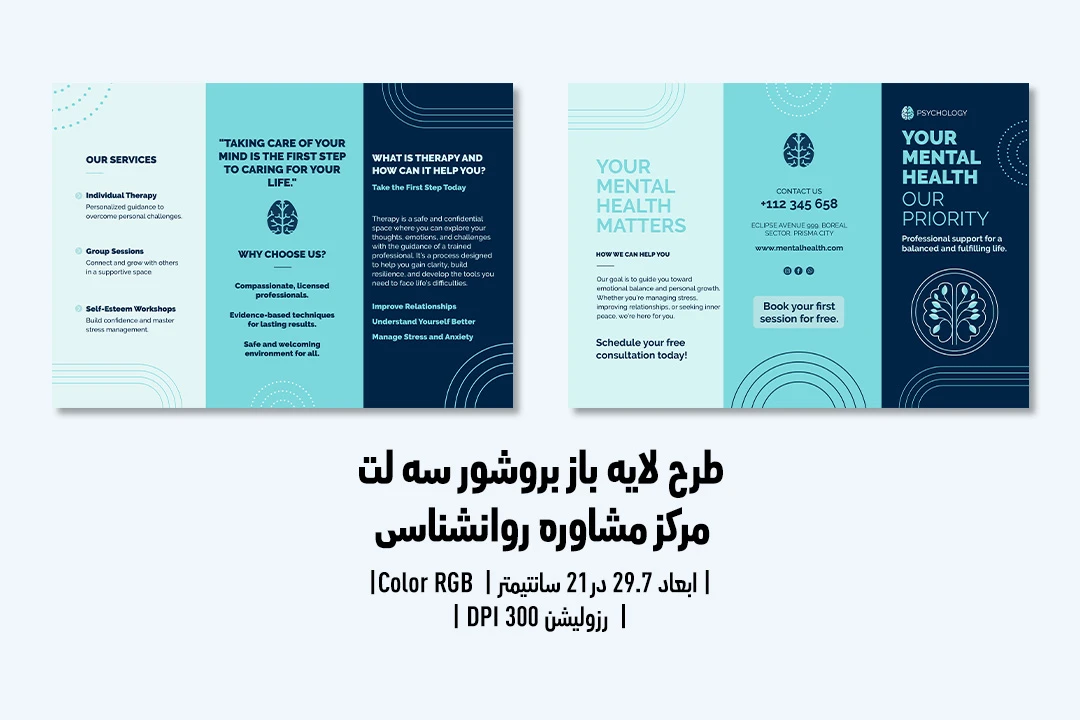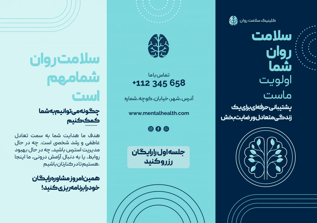 طراحی استاندارد، چینش هوشمندانه اطلاعات، رنگهای آرامشبخش و امکان شخصیسازی کامل باعث شده این بروشور بهترین انتخاب برای کلینیکهای سلامت روان، مراکز مشاوره و تراپیستها باشد.