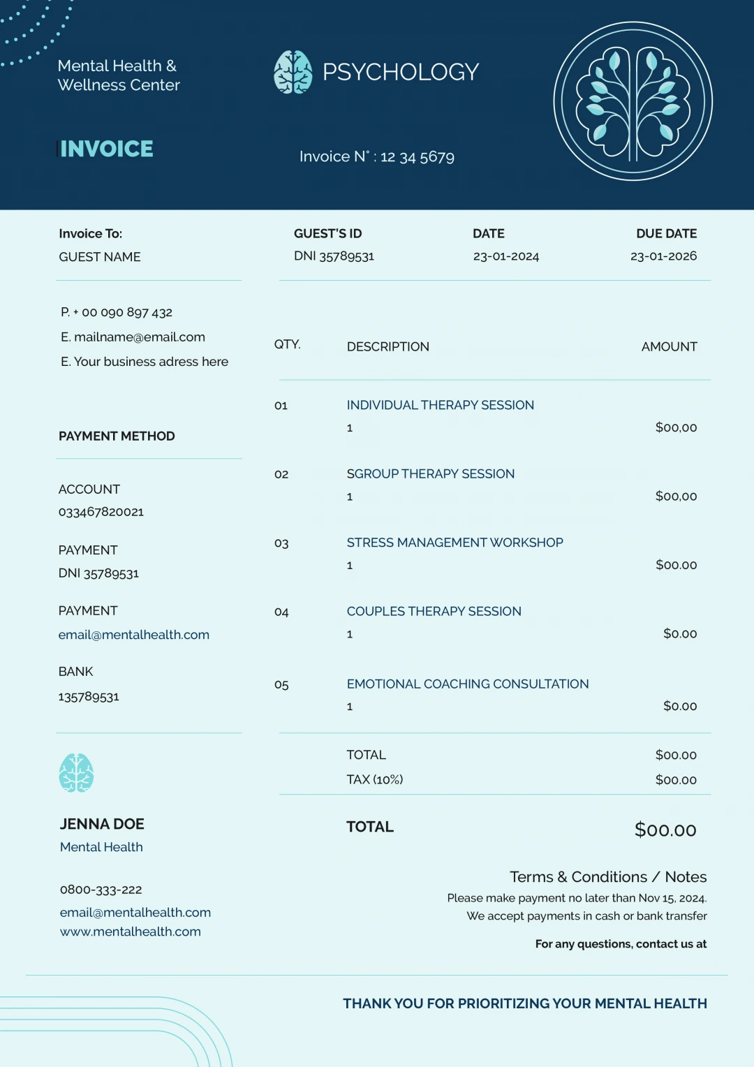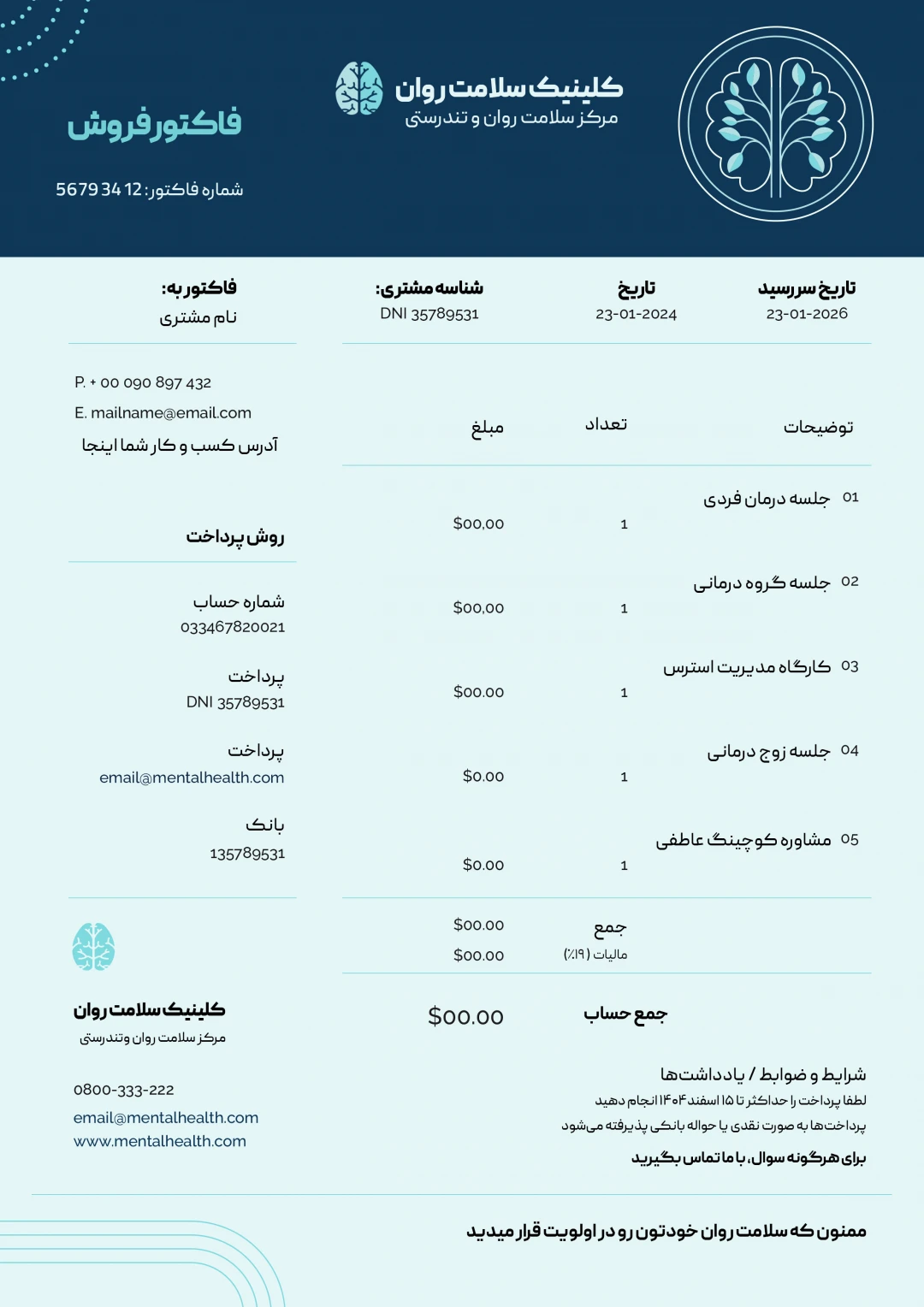 اگر برای کلینیک روانشناسی، مرکز مشاوره، تراپیست، رواندرمانگر یا مجموعه خدمات درمانی خود به یک فاکتور رسمی، استاندارد، منظم و کاملاً قابلویرایش نیاز دارید، این فایل دقیقاً مناسب شماست.