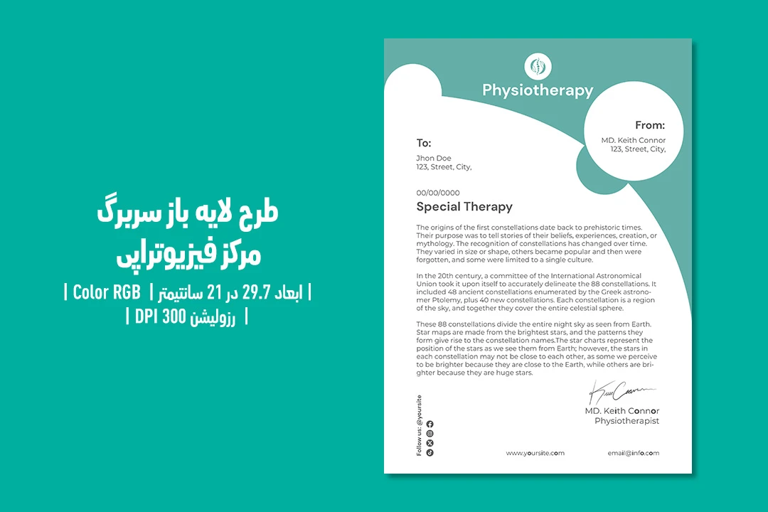 یک سربرگ استاندارد، خوانا و خوشچیدمان برای مراکز درمانی از پایههای ساخت هویت حرفهای است. این طرح با ساختار دوزبانه، فضای کافی برای توضیحات درمانی، نسخهنویسی، گزارشهای بالینی و مکاتبات رسمی طراحی شده است و بهطور کامل با برند کلینیک شما هماهنگ میشود.