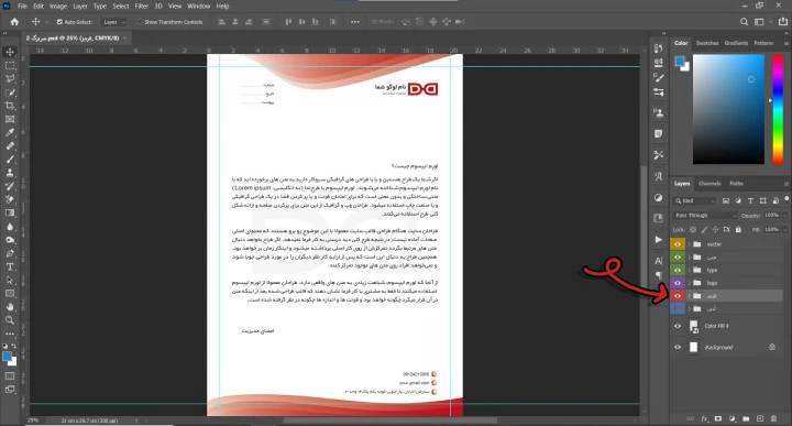 برای دیدن سربرگ آبی فقط کافی است در داخل فتوشاپ در قسمت لایه ها با کلیک چپ موس چشم لایه قرمز را غیرفعال و چشم لایه آبی را فعال کنید