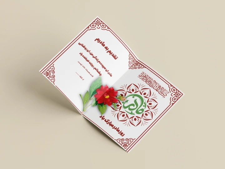 طرح لایه باز کارت پستال تبریک روز مادر و ولادت حضرت فاطمه زهرا (س) با طراحی سنتی، خطاطی زیبا و ترکیب رنگی چشمنواز، مناسب استفاده در چاپ، هدیه، مراسم مذهبی و تبریک رسمی یا صمیمی میباشد. این کارت پستال در فرمتهای EPS و Ai ارائه شده و کاملاً قابل ویرایش در نرمافزار ایلاستریتور است.