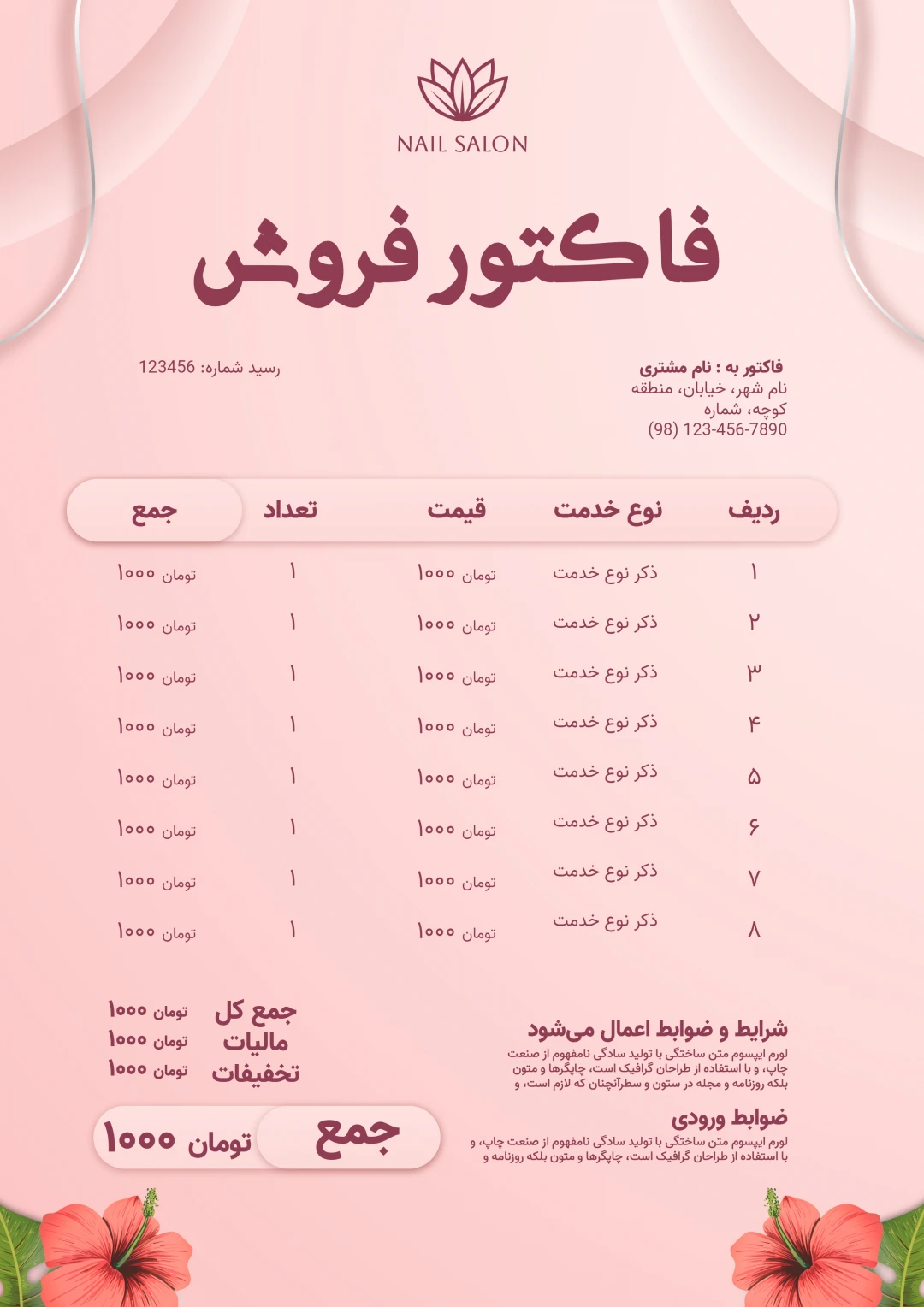 این فاکتور با ترکیب رنگ‌های زنانه و جذاب، بخش‌بندی استاندارد و چیدمان تمیز طراحی شده تا ثبت خدمات، قیمت‌ها، اطلاعات مشتری و وضعیت پرداخت به ساده‌ترین شکل ممکن انجام شود.