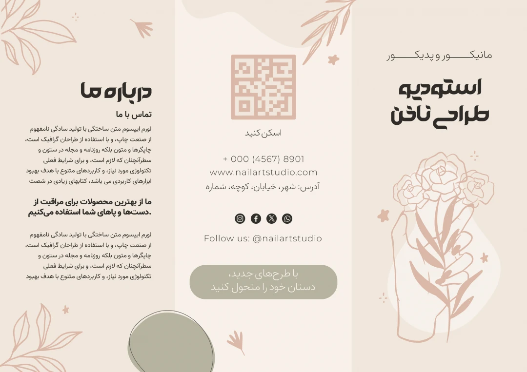 اگر قرار است خدمات سالن ناخن را در یک بروشور خوشچشم، منظم و حرفهای معرفی کنی، این بروشور سهلَت دقیقاً همان قالبی است که پیام سالن را در یک نگاه منتقل میکند. چه برای چاپ دورو، چه برای استفاده دیجیتال در سایت و شبکههای اجتماعی، این طراحی همهچیز را مرتب و زیبا کنار هم مینشاند؛ از کاشت و ژلیش گرفته تا طراحی، مانیکور، پدیکور و ترمیم.