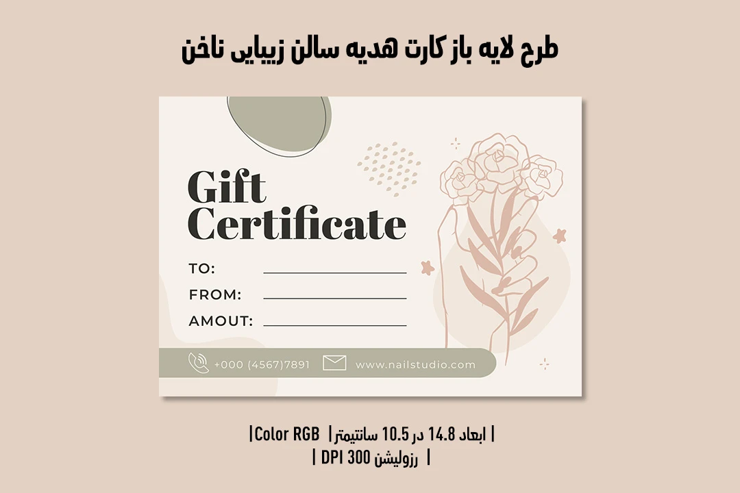 کارت هدیه و کوپن تخفیف لایه‌باز سالن زیبایی و کاشت ناخن | طراحی ظریف، لوکس و کاملاً قابل‌ویرایش | فارسی و انگلیسی