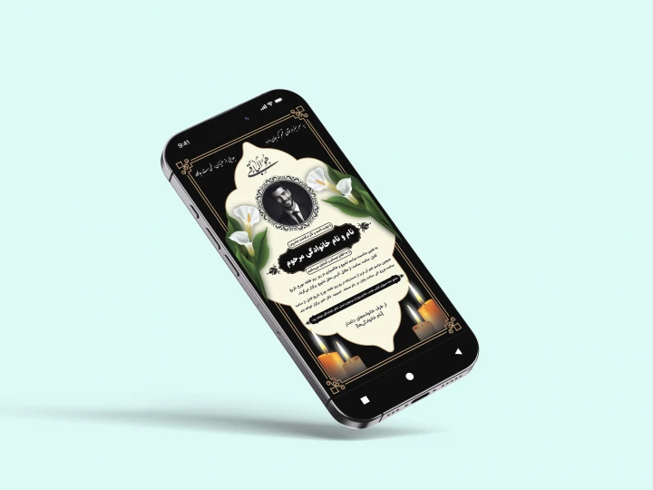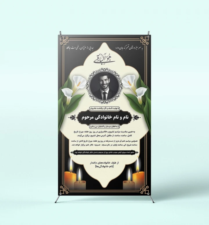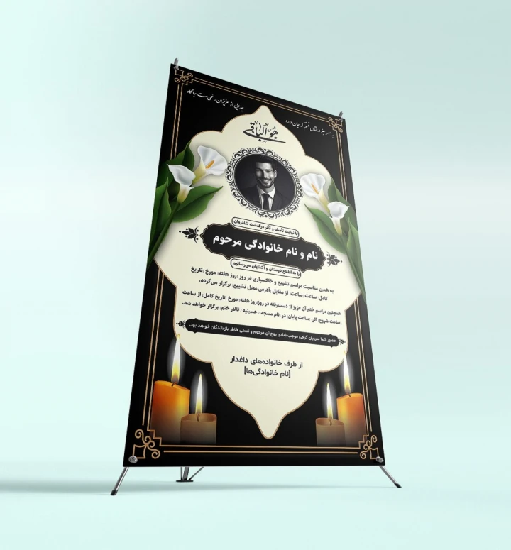 این طرح لایهباز استند تسلیت با طراحی رسمی و شکیل، گزینهای مناسب برای استفاده در مراسم ترحیم، یادبود، چهلم و سالگرد درگذشت میباشد. ترکیب رنگ تیره، المانهای گل و شمع و کادربندی کلاسیک، جلوهای سنگین و محترمانه به طرح داده و آن را برای فضاهای مذهبی و مراسم رسمی کاملاً ایدهآل کرده است.