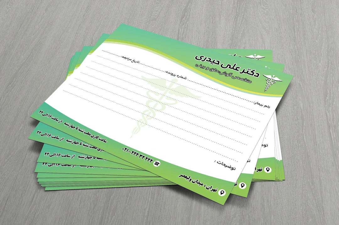 سرنسخه پزشکی در سایز A5 با طراحی مدرن و رسمی، ارائهشده در دو رنگبندی آبی و سبز جهت انتخاب سلیقهای پزشکان و کلینیکها.
