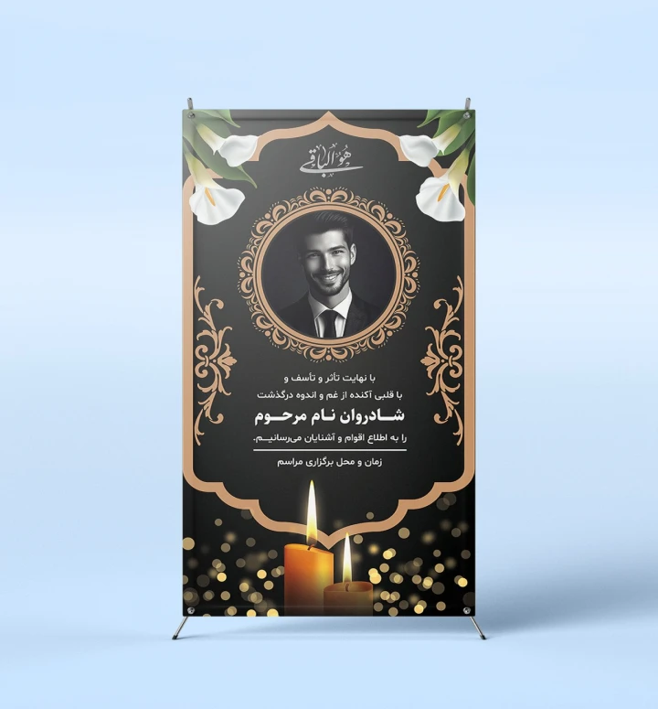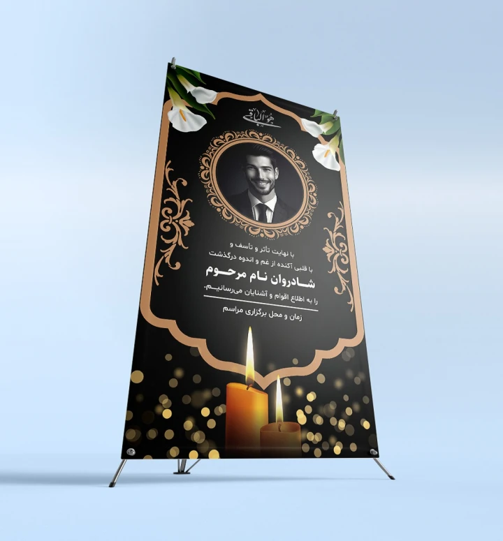 این طرح لایه باز بنر و پوستر تسلیت با طراحی رسمی، سنگین و وقارمند، انتخابی مناسب برای اطلاعرسانی مراسم ترحیم، یادبود و عرض تسلیت است. استفاده از ترکیب رنگ تیره بههمراه المانهای کلاسیک، قاب تزیینی، شمع و گلهای سفید، حس احترام، همدردی و آرامش را بهخوبی به مخاطب منتقل میکند و برای فضاهای رسمی و مذهبی کاملاً مناسب است.