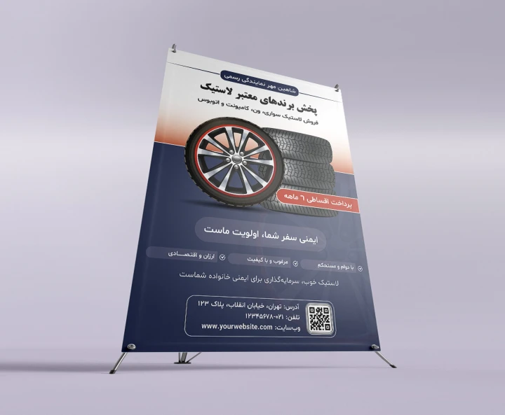 طرح لایه باز بنر، استند و تراکت تبلیغاتی فروش لاستیک خودرو با طراحی حرفهای، رنگبندی جذاب و چیدمان اصولی، مناسب برای استفاده در تبلیغات محیطی، فروشگاههای قطعات خودرو، نمایندگیهای تایر و حتی مشاغل دیگر با تغییرات جزئی در متن.