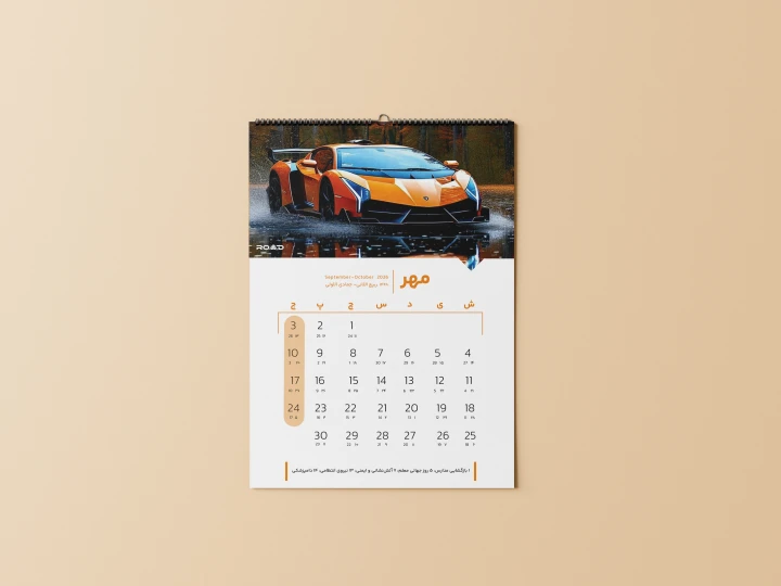این تقویم دیواری در سایز A3 با طراحی مدرن و جذاب، بر پایه تصاویر باکیفیت از خودروها تهیه شده و در نرمافزار Photoshop طراحی شده است. این فایل کاملاً مناسب نمایشگاههای ماشین، فعالان خرید و فروش خودرو، شرکتهای خودرویی و کسبوکارهای مرتبط با حوزه خودرو است.