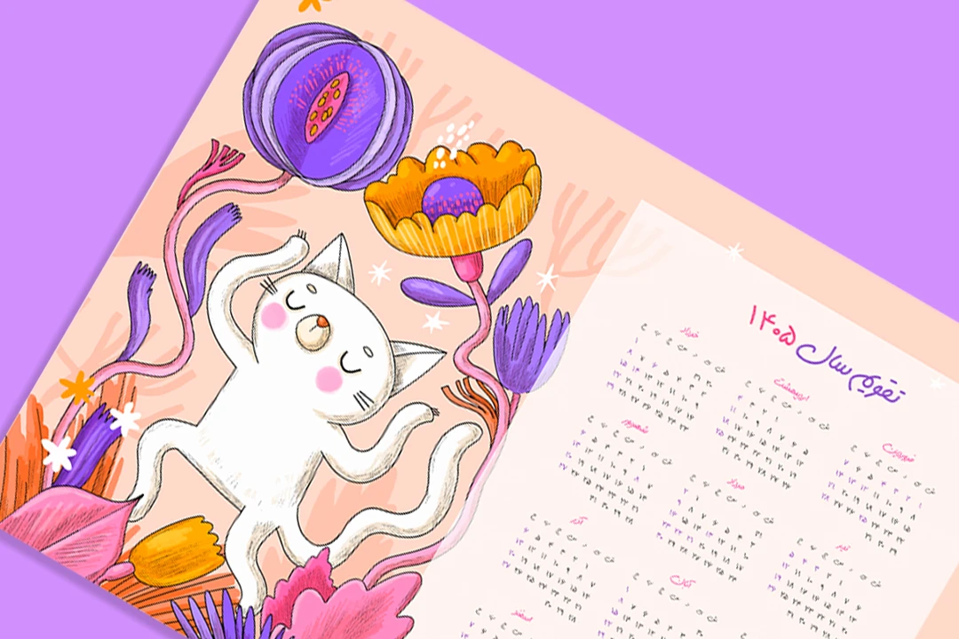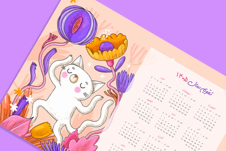 تقویم دیواری لایه باز سال 1405 فانتزی با طرح گربه – سایز A3