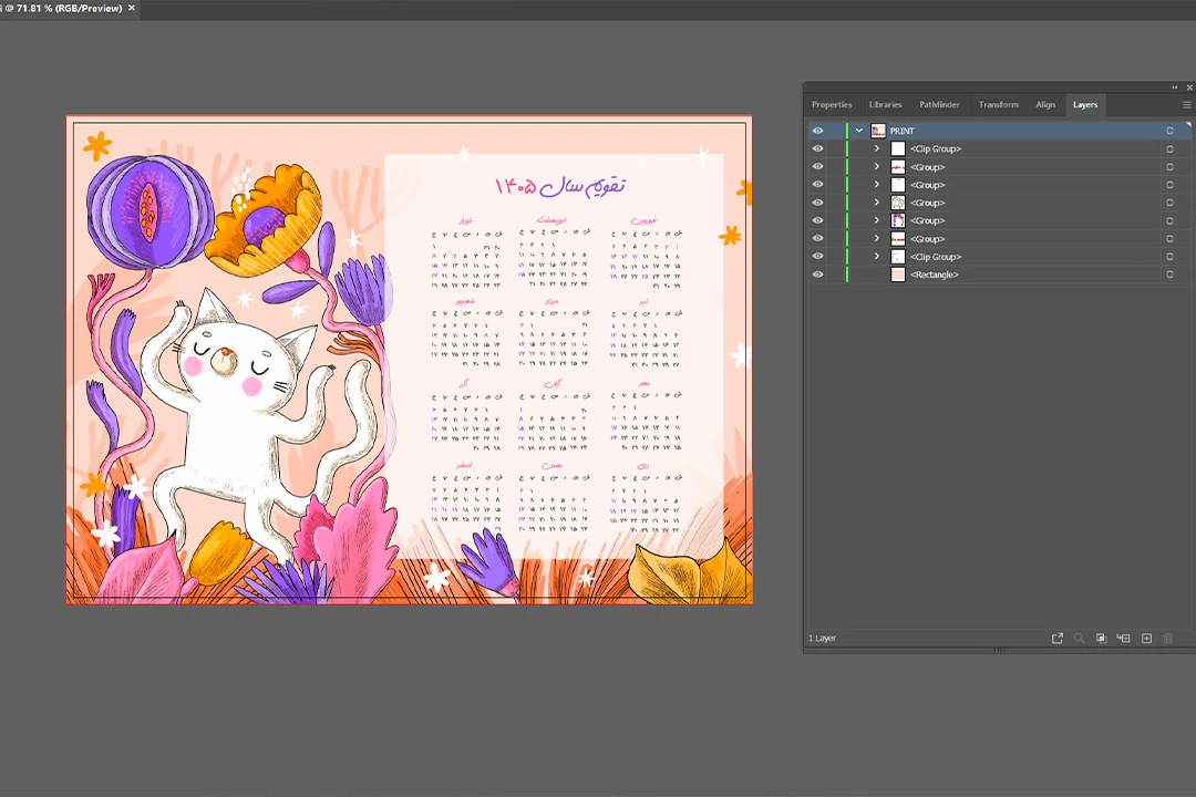 این تقویم شمسی به صورت لایه باز طراحی شده و در فرمتهای AI، JPG و PDF ارائه میشود تا به راحتی بتوانید آن را ویرایش یا چاپ کنید.