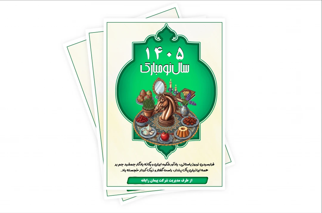 طرح لایه باز کارت تبریک عید نوروز 1405با فرمت psd و قابل ویرایش در نرم افزار فتوشاپ طراحی شده است. طرح لایه باز کارت پستال نوروز را با تغییر لوگو، تصاویر و رنگ ها میتوانید کاملا شخصی سازی و قابل استفاده برای همه مشاغل و خدمات کنید.
