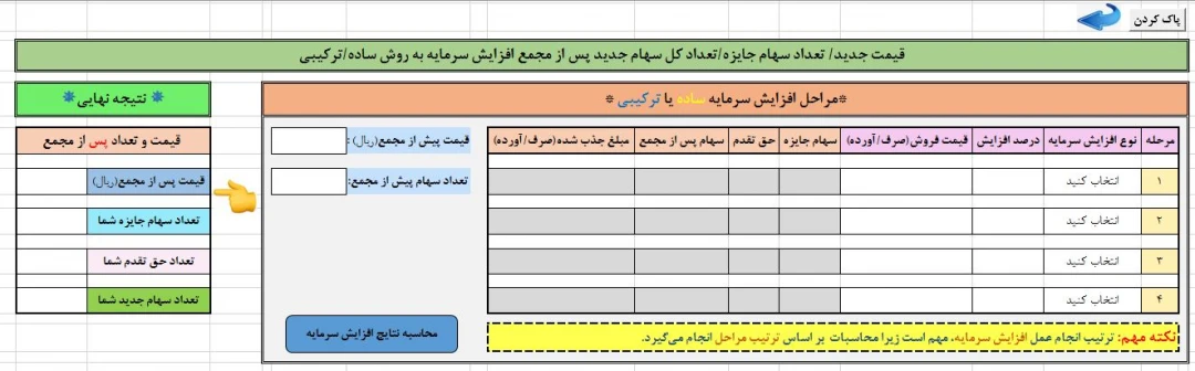 فعالان بازار سرمایه میتوانند توسط این فایل اکسل که نوعی ماشین حساب هست،بصورت خودکارو اتوماتیک،تعداد سهام جدید و همچنین قیمت جدید سهم پس از مجمع افزایش سرمایه،تعداد سهام جایزه و تعداد حق تقدم پس از برگزاری مجمع افزایش سرمایه را هم به دو صورت، هم در افزایش سرمایه ساده/تکی(افزایش سرمایه فقط از یک محل) و هم از افزایش سرمایه ترکیبی(افزایش سرمایه از بیش از یک محل و از چند محل) را محاسبه کنند.