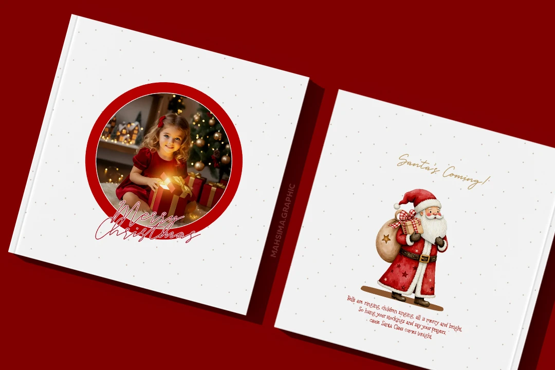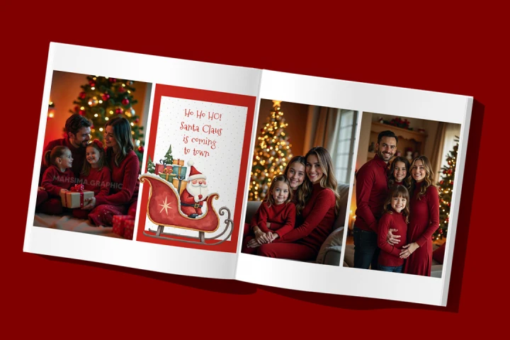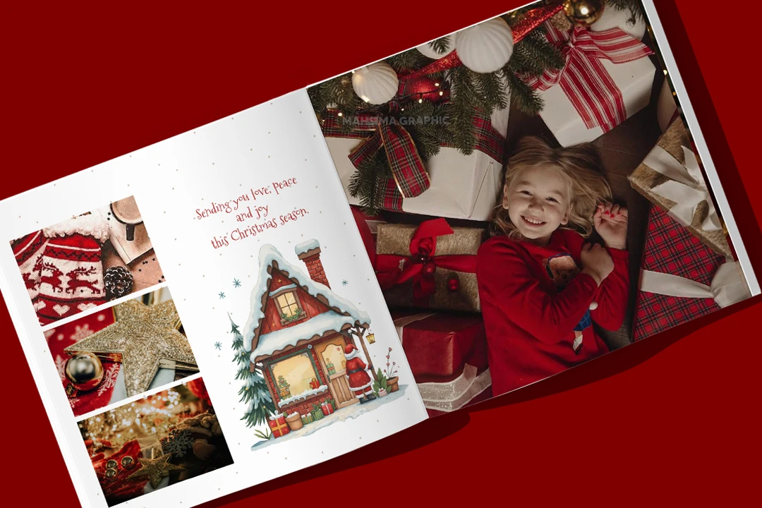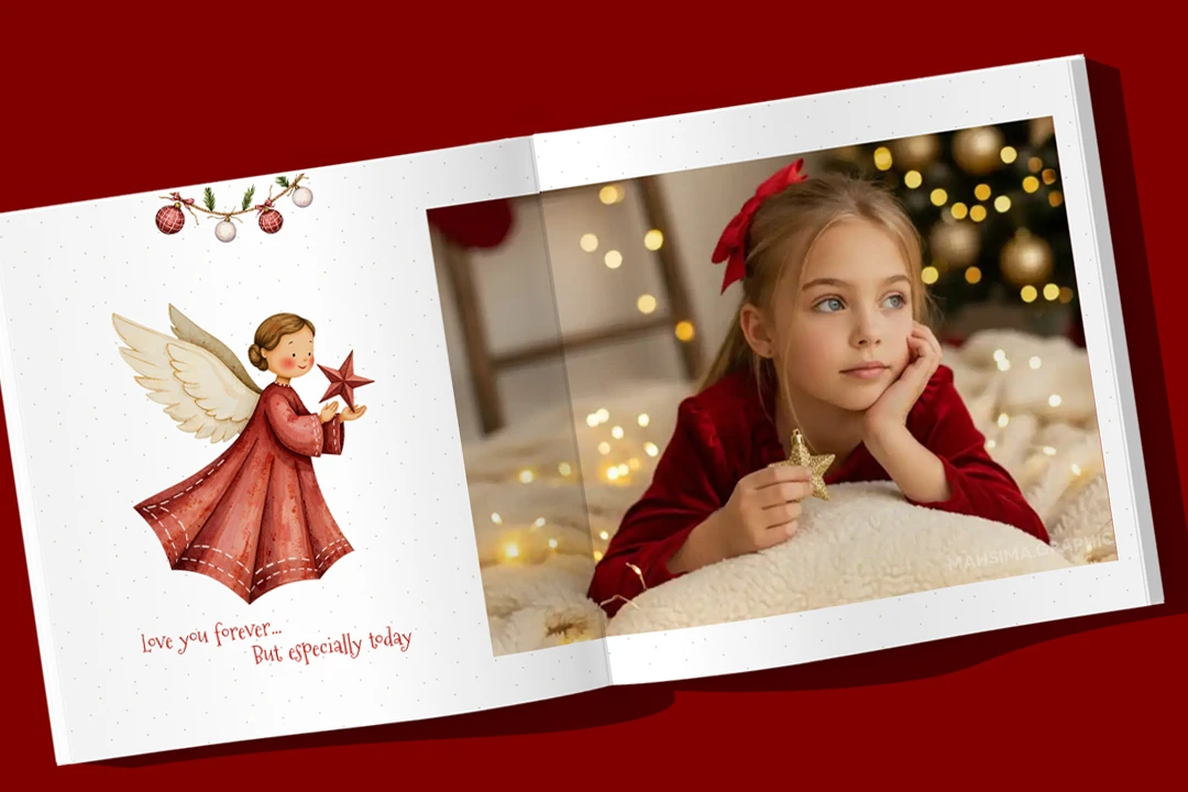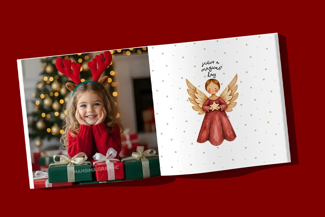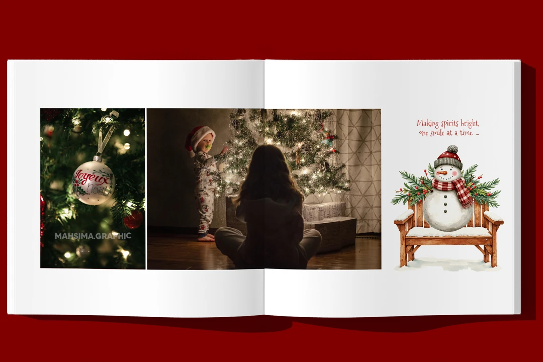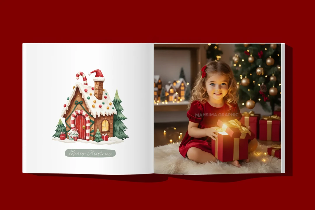 طراحی این آلبوم کودکانه کریسمسی با المانهای دوستداشتنی و فانتزی مانند بابانوئل، خانههای کریسمسی، درخت کریسمس، فرشته، ستاره، آدمبرفی و المانهای زمستانی انجام شده و فضایی گرم، شاد و خاطرهانگیز برای عکسهای کودک ایجاد میکند.