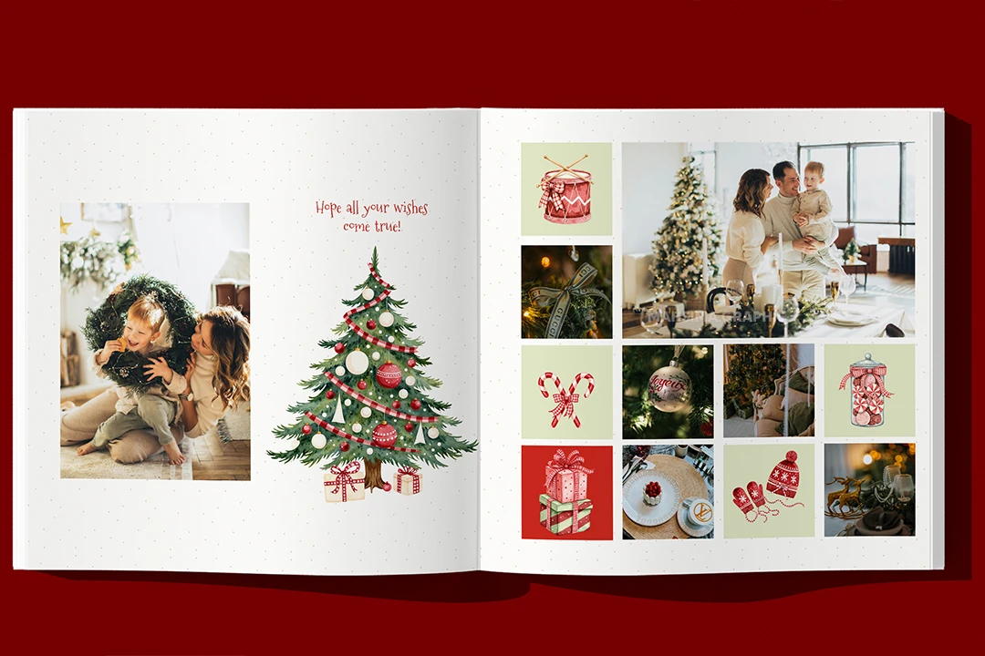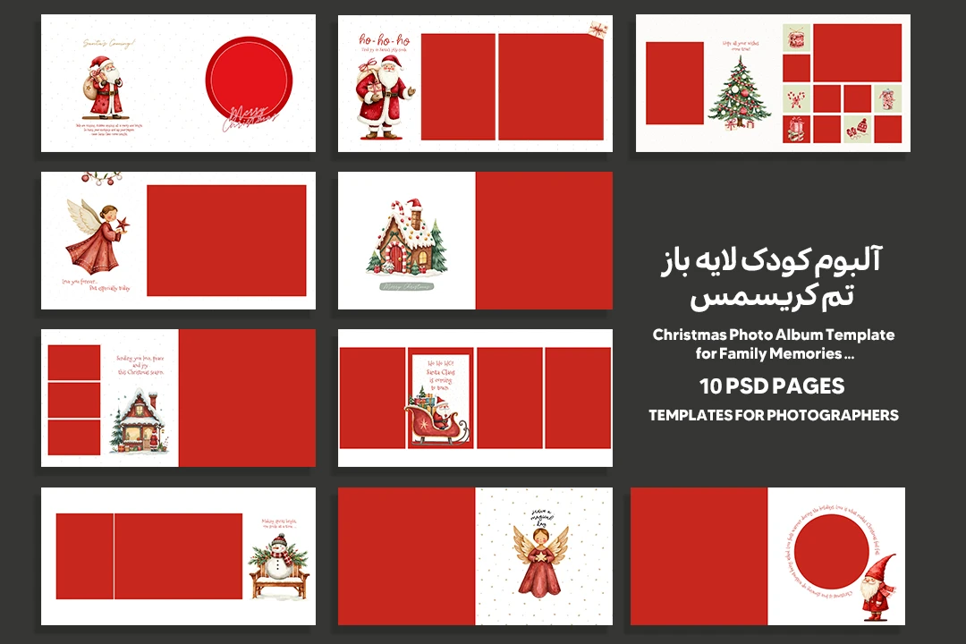 صفحات داخلی با طراحی هماهنگ و المانهای متنوع کریسمسی، مناسب چینش عکسهای کودک در یک آلبوم خاص و متفاوت.