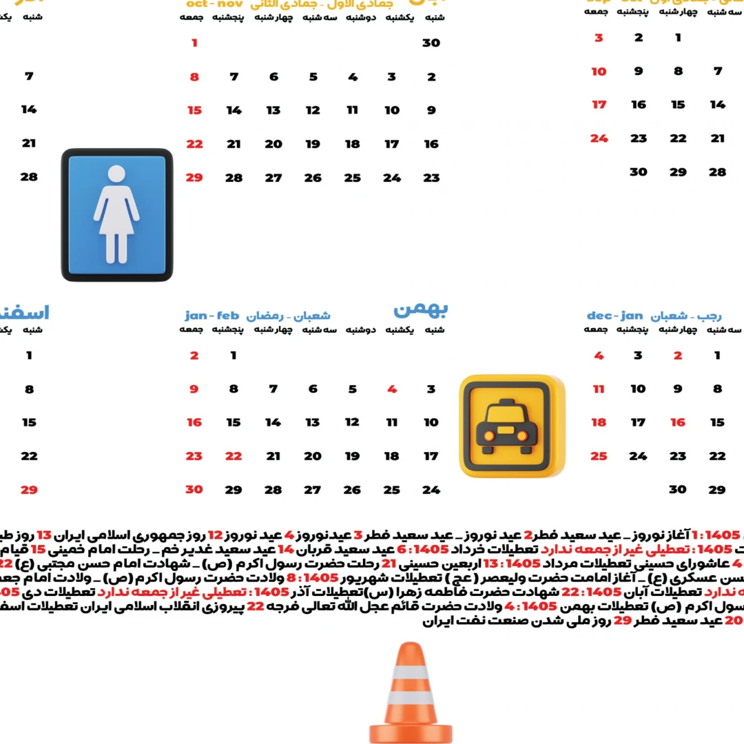 تقویم سال ۱۴۰۵ الگو گرفته از تقویم رسمی منتشر شده توسط شورای مرکز تقويم مؤسسۀ ژئوفيزيك دانشگاه تهران بوده و در صورت وجود اشکال مسئولیتی بر عهده طراح نمیباشد . فایل pdf تقویم در فایل قرار داده شده و خریدار میتواند طرح را با آن چک و مطابقت داده و اقدام به چاپ کند . امکان تغییر تاریخ تعطیلات و مناسبات توسط شورای مرکز تقويم مؤسسۀ ژئوفيزيك دانشگاه تهران وجود داشته و مسئولیتی به عهده طراح نمی باشد