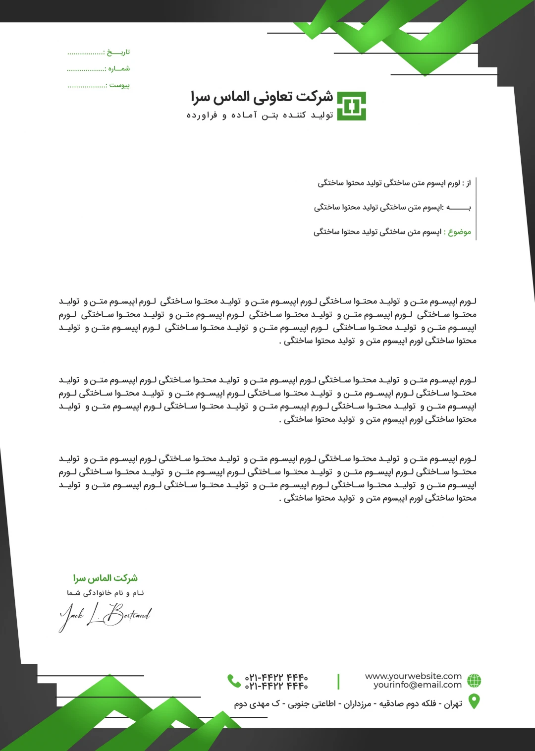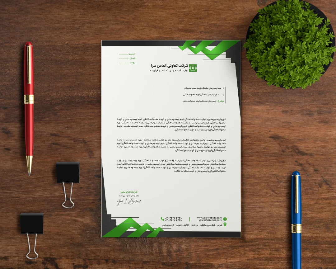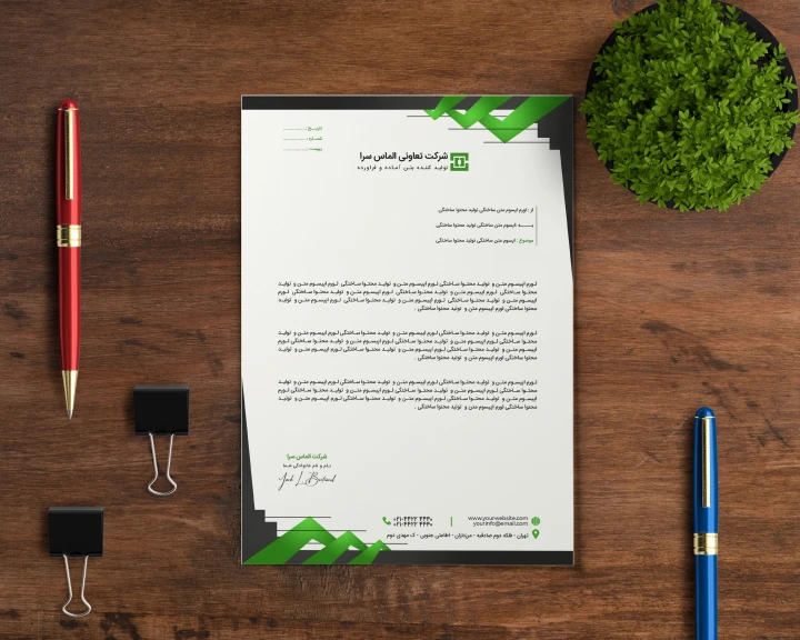 - **نامههای رسمی**: سربرگ شامل اطلاعاتی مانند نام سازمان، آدرس، لوگو، شماره تماس و سایر اطلاعات تماس است.