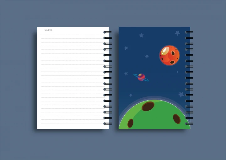 طرح پوستر جدید لایه باز جلد دفتر مشق و نقاشی کودکان نوجوانان دبستان مهد کودک مدرسه سایز B5 فنری و معمولی با طرح فضا و کاراکتر فضانورد و سیاره ها، لایه باز ایلاستریتور، با خروجی PDF JPG.