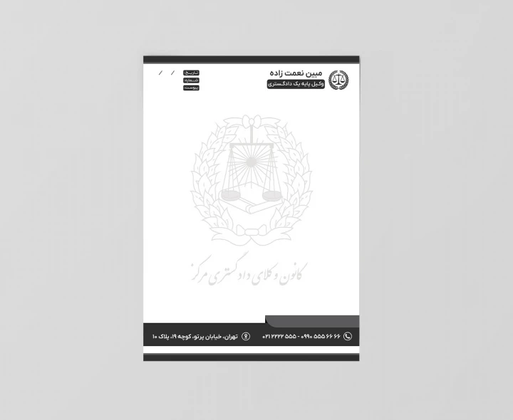 فایل طرح سربرگ خاکستری وکیل وکالت پایه یک دادگستری کانون وکلا لایه باز فتوشاپ psd ، سایز A4، رزولوشن 300، لوگوی کانون وکلا دادگستری مرکز به همراه فایل طراحی زمینه در ایلاستریتور