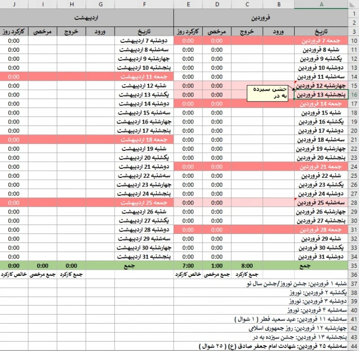 دانلود فایل اکسل تقویم و تایم شیت سال 1405