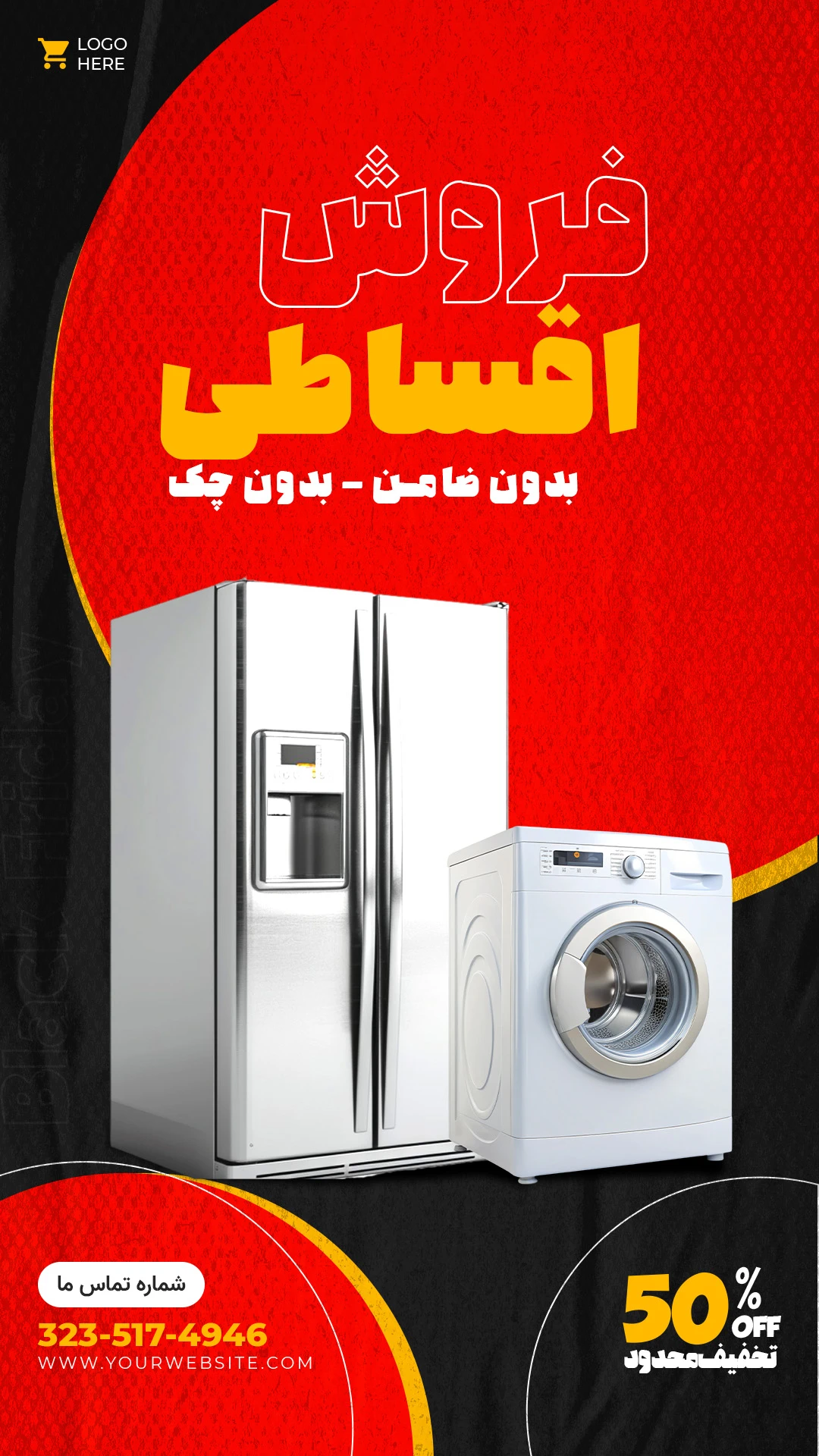 · رنگبندی مشکی و قرمز برای انتقال حس تخفیف، فوریت و هیجان