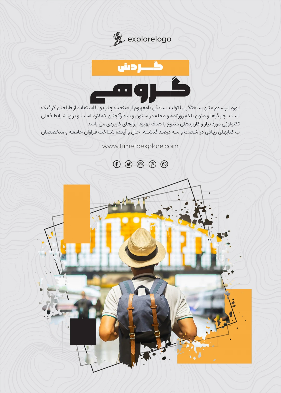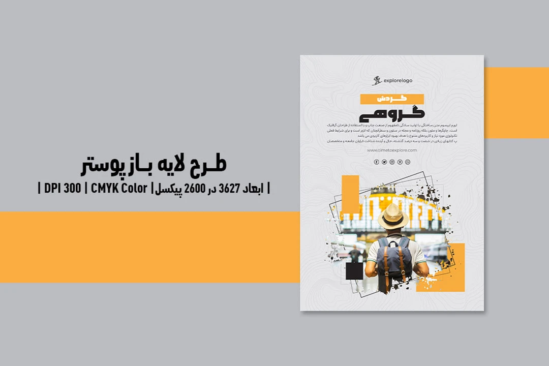 پوستر گردش گروهی یک طرح لایه باز حرفهای برای معرفی برنامه های گردش گروهی آژانس مسافرتی و گردشگری شما است. این پوستر با ابعاد 3627 × 2600 پیکسل، کیفیت 300 DPI و مد رنگی CMYK طراحی شده و وضوح بسیار بالایی برای چاپ و تبلیغات دیجیتال ارائه میدهد. طراحی حرفهای آن به باشگاه شما کمک میکند کلاب خود را جذابتر معرفی کنند.