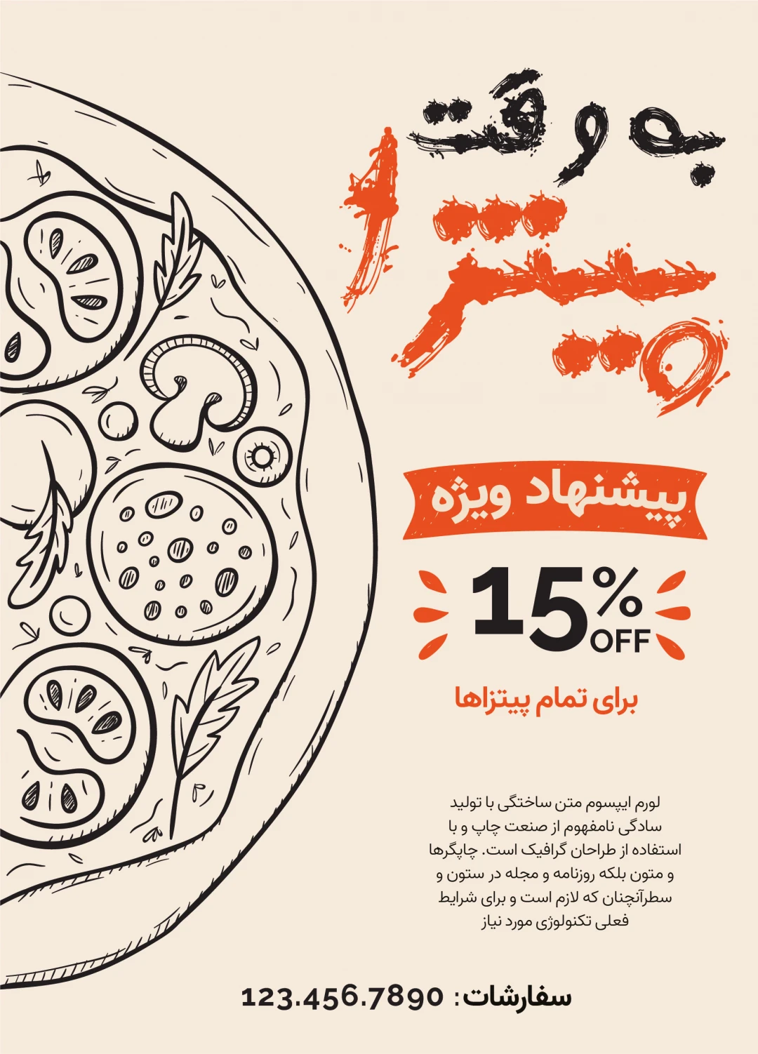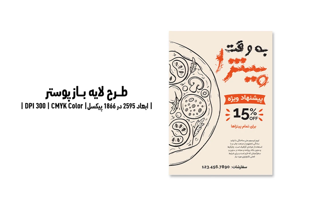 این پوستر تبلیغاتی با ترکیب رنگی کرم و قرمز طراحی شده است. این ترکیب حس بهداشت و خوشمزگی ایجاد کرده و مخاطبان را جذب میکند. در طراحی آن از تصویر پیتزا استفاده شده است. این عناصر فعالیت شما را بهصورت حرفهای نمایش میدهند.