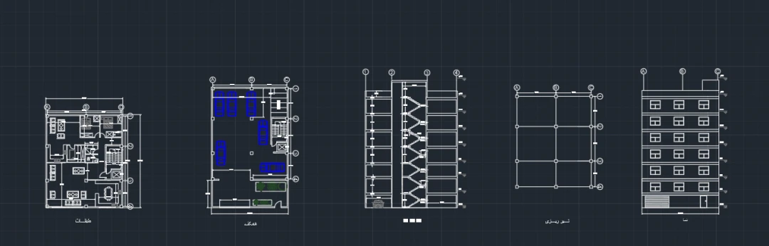 به همراه پلان طبقات، پارکینگ، تیر ریزی، برش راه پله، نما